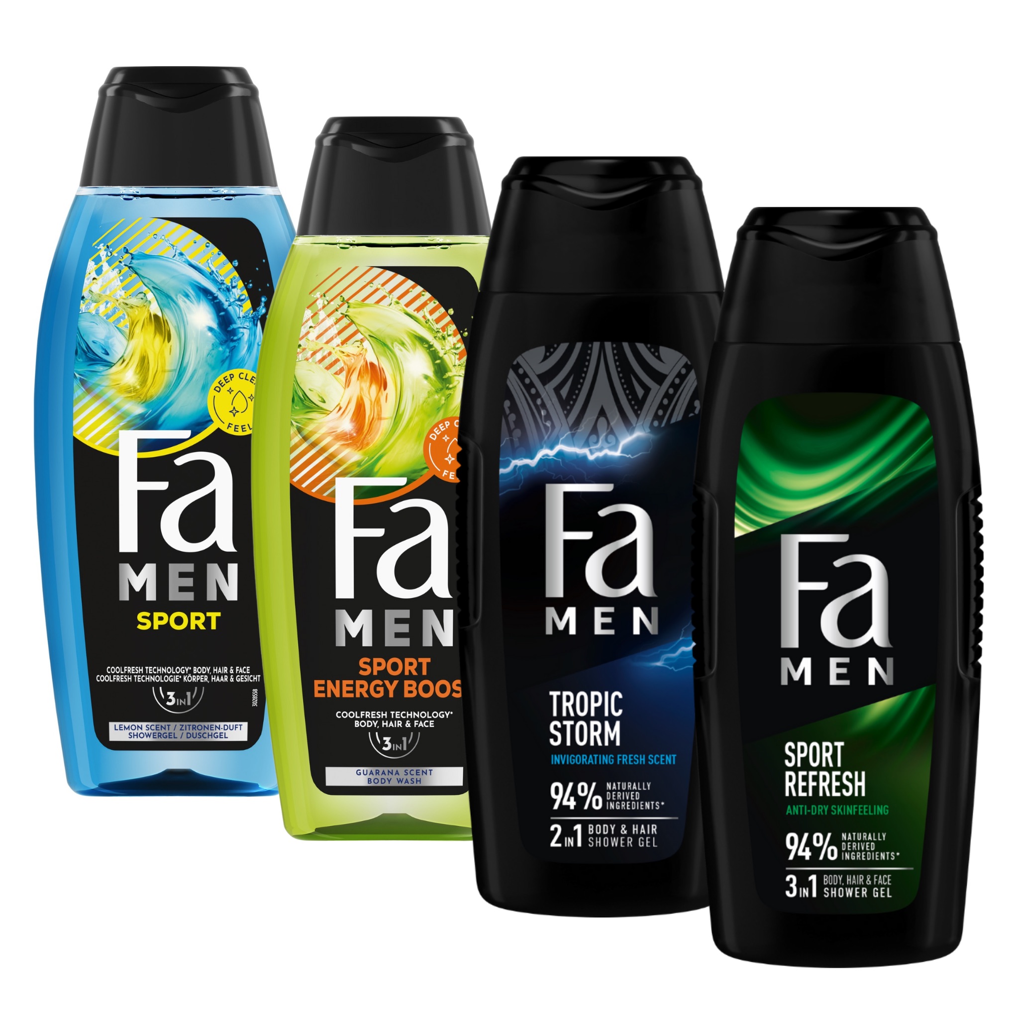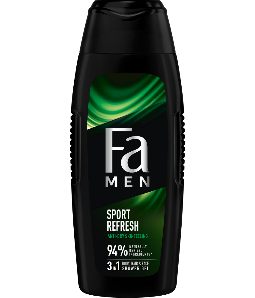Poznaj nową odsłonę fascynującej świeżości! Wybierz Fa Men Sport Refresh żel pod prysznic z formułą 3w1: do efektywnego oczyszczania ciała, twarzy i włosów o odświeżającym i energetyzującym zapachu cytryny i piżma, który zapewni Ci kompleksowe pobudzenie pod prysznicem. Odśwież swoje ciało & umysł i pozwól swoim zmysłom odkrywać nowe doznania każdego dnia.