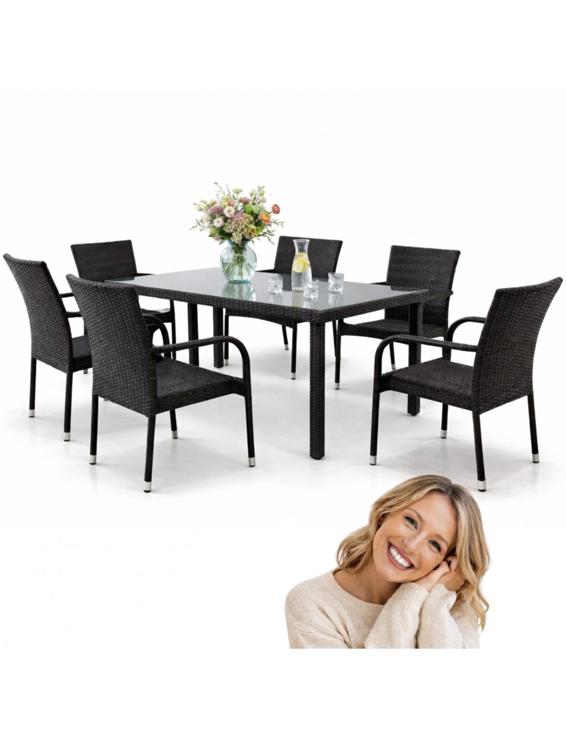 ✅ Blat z hartowanego szkła i technorattan są proste w czyszczeniu, co pozwala na szybkie i bezproblemowe utrzymanie zestawu w doskonałym stanie