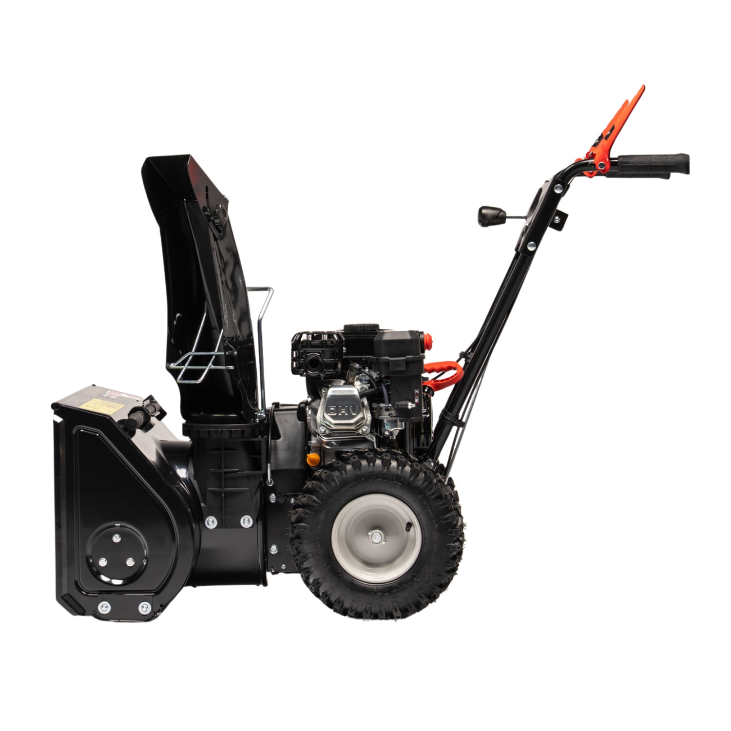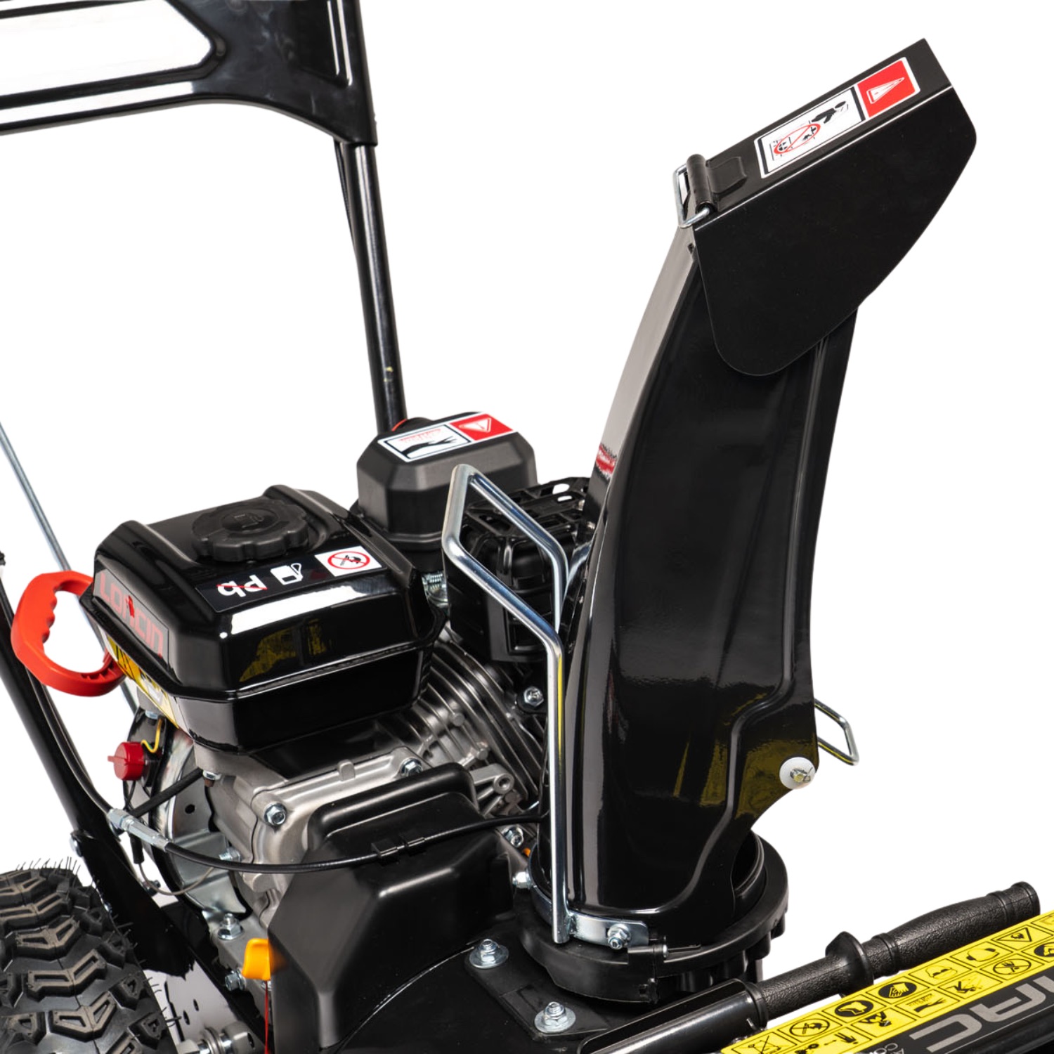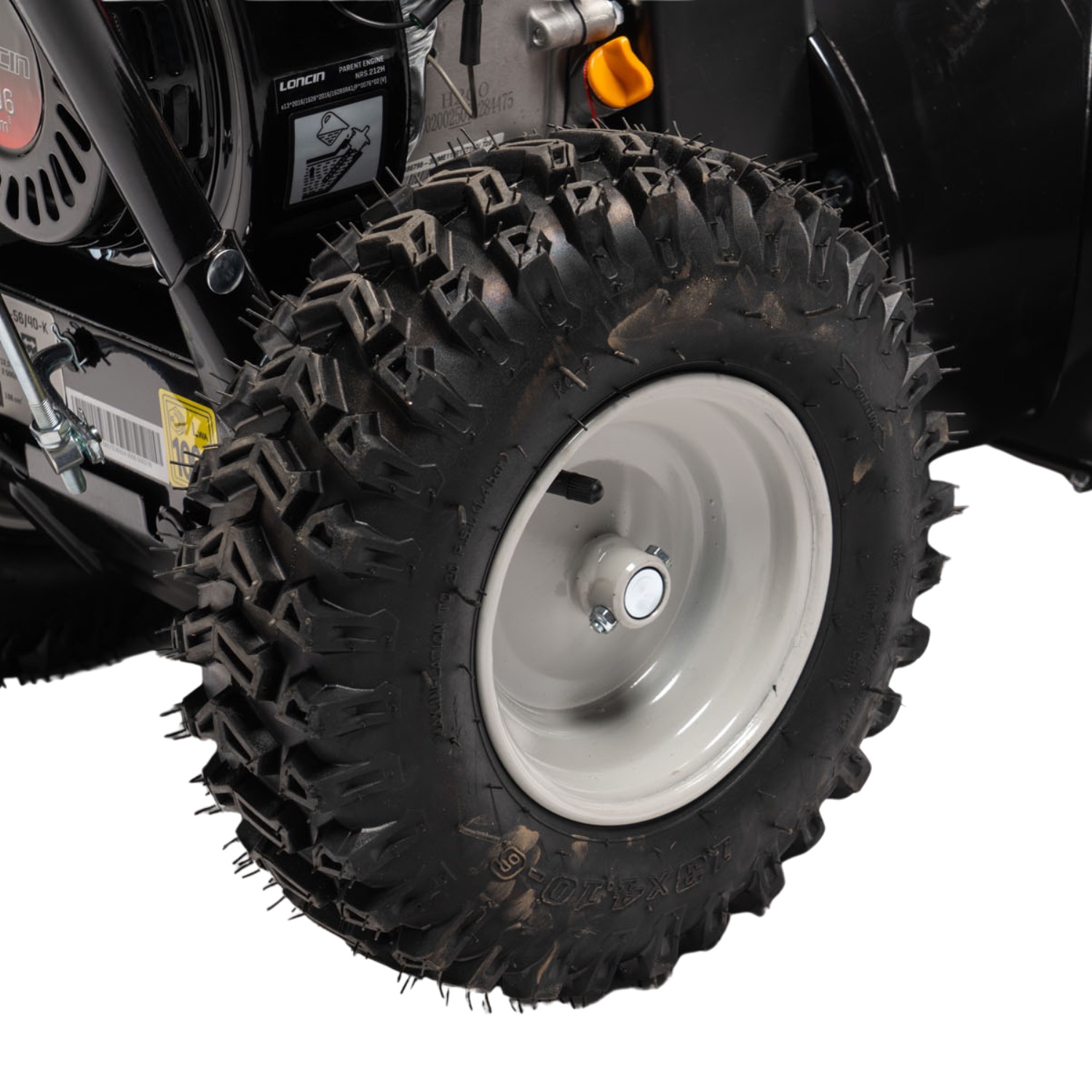 Ergonomiczna rękojeść z regulacją wysokości oraz duże, gumowe koła z bieżnikiem sprawiają, że odśnieżarka prowadzi się lekko i bez wysiłku, nawet po nierównym czy zaśnieżonym terenie.