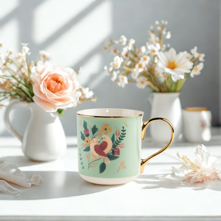 Kubek z motywem ptaków zielonych to doskonałe połączenie stylu i funkcjonalności. Uroczy wzór w ptaki otoczonych kwiatami zachwyci każdego miłośnika natury i subtelnych dodatków do domu.
