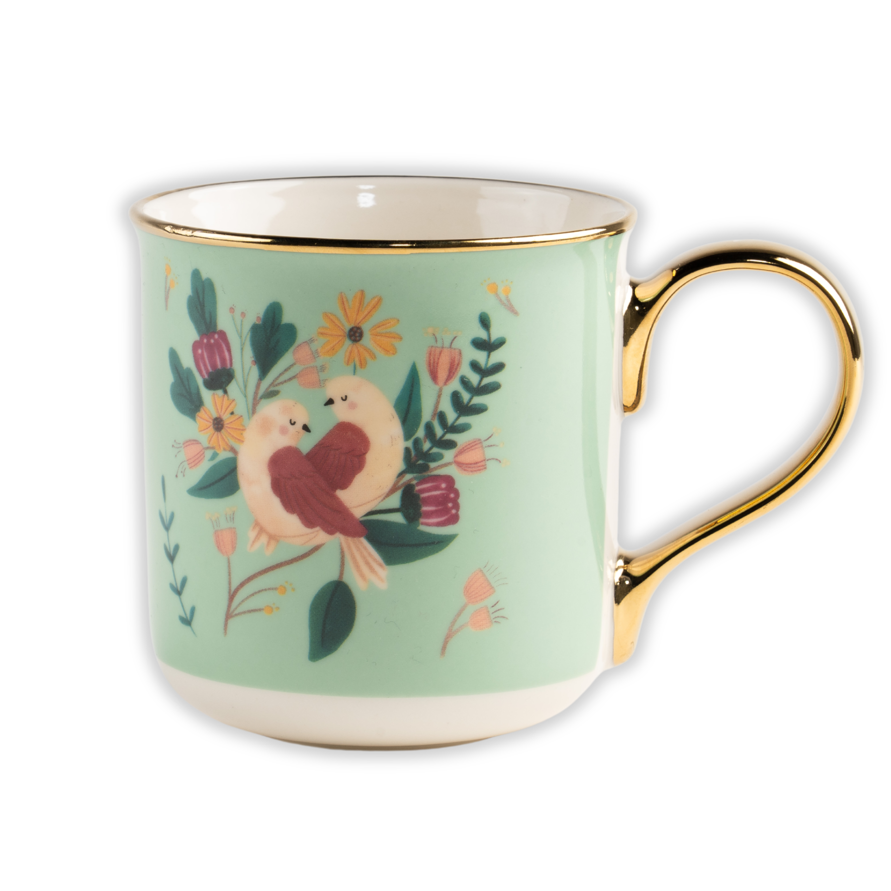 Kubek porcelana ze złotym uchem wprowadza do Twojej kuchni nutę luksusu, a subtelny motyw ptaków tworzy wyjątkową atmosferę we wnętrzu.