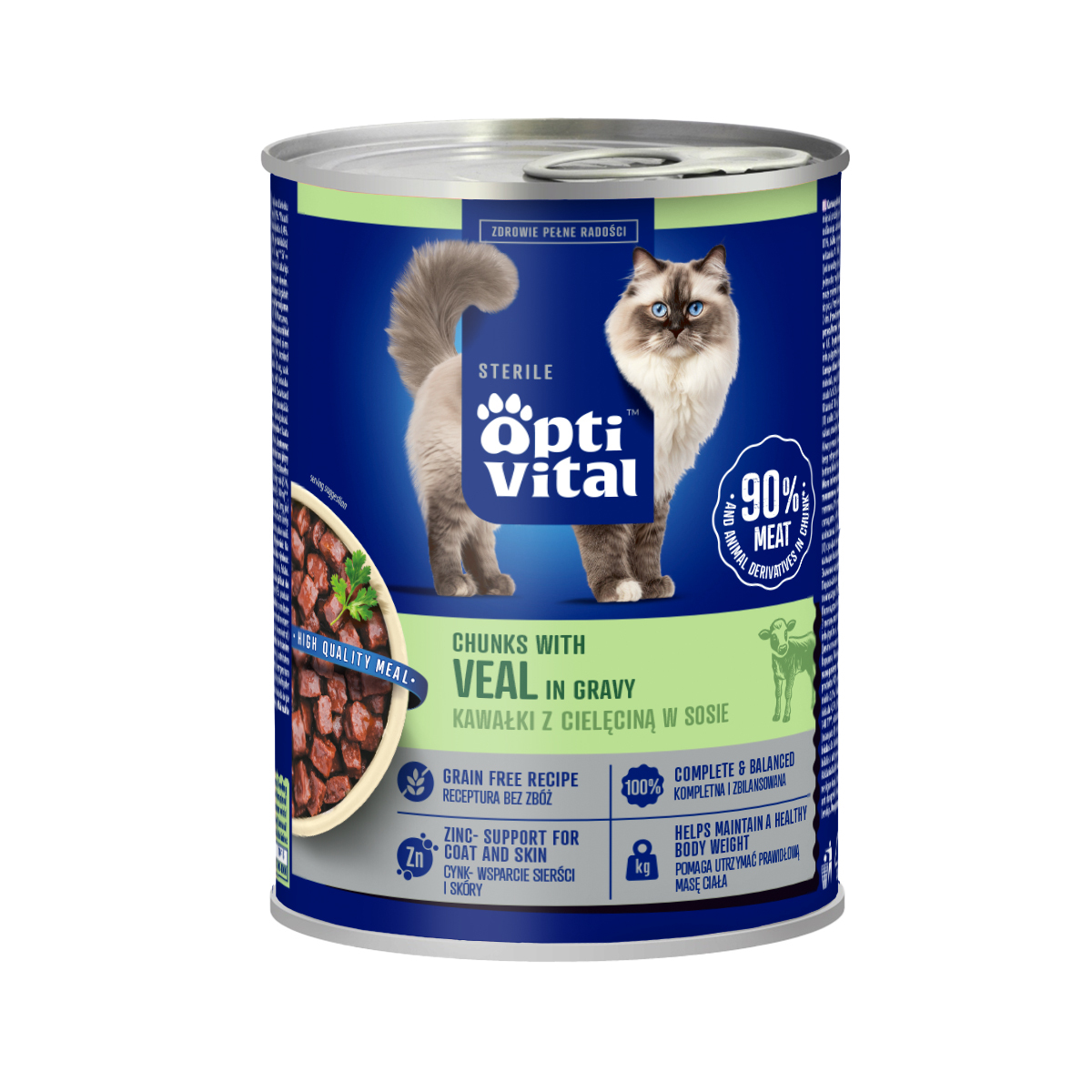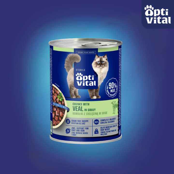 OptiVital Sterile z cielęciną w sosie to pełnoporcjowy posiłek stworzony specjalnie dla kotów po sterylizacji. Łączy naturalny smak mięsa z recepturą dostosowaną do codziennych potrzeb Twojego pupila.