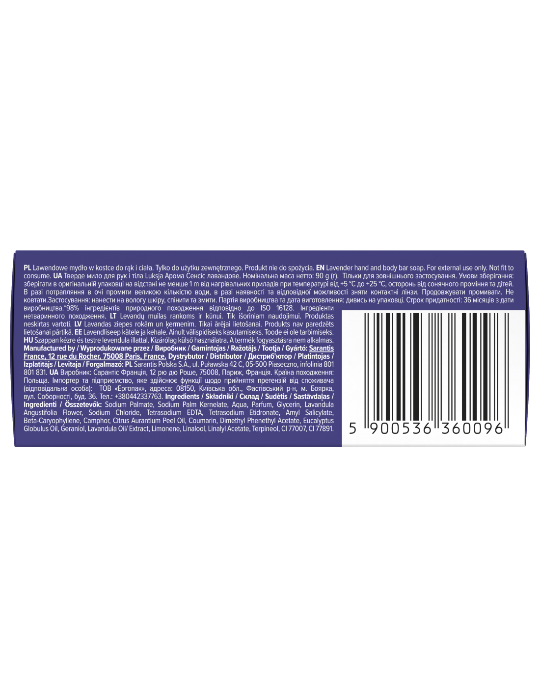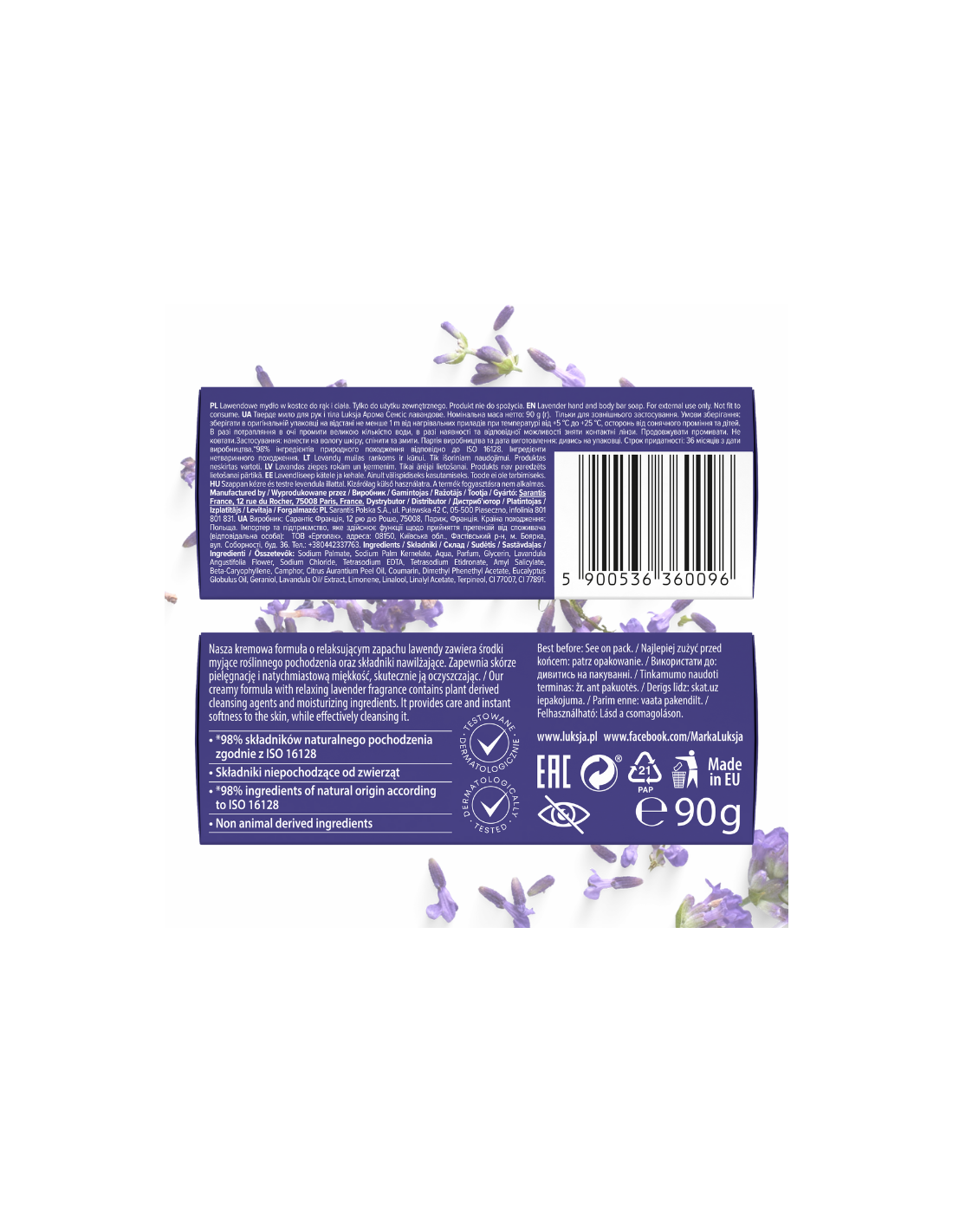 Sodium Palmate, Sodium Palm Kernelate, Aqua, Parfum, Glycerin, Lavandula Angustifolia Flower, Sodium Chloride, Tetrasodium EDTA, Tetrasodium Etidronate, Amyl Salicylate, Beta-Caryophyllene, Camphor, Citrus Aurantium Peel Oil, Coumarin, Dimethyl Phenethyl Acetate, Eucalyptus Globulus Oil, Geraniol, Lavandula Oil/ Extract, Limonene, Linalool, Linalyl Acetate, Terpineol, CI 77007, CI 77891.