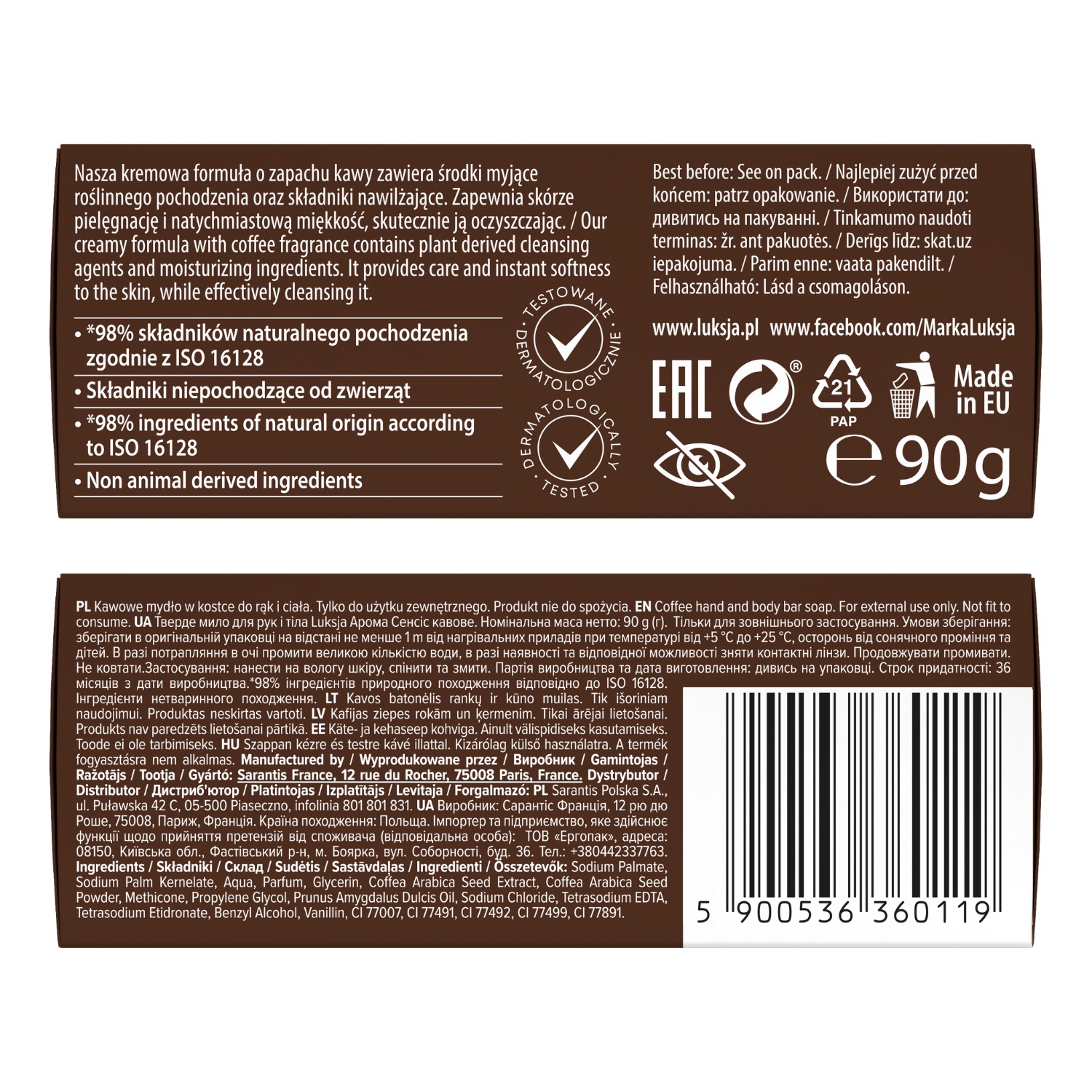 Sodium Palmate, Sodium Palm Kernelate, Aqua, Parfum, Glycerin, Coffea Arabica Seed Extract, Coffea Arabica Seed Powder, Methicone, Propylene Glycol, Prunus Amygdalus Dulcis Oil, Sodium Chloride, Tetrasodium EDTA, Tetrasodium Etidronate, Benzyl Alcohol, Vanillin, CI 77007, CI 77491, CI 77492, CI 77499, CI 77891.