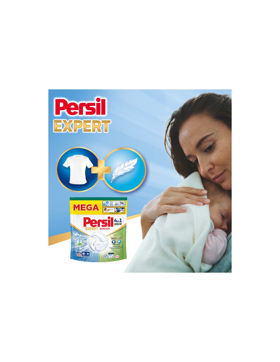 Nasze specjalistyczne kapsułki Persil Discs 4w1 Expert Sensitive z hipoalergicznym, delikatnym perfumem pozostawiają łagodny zapach czystości na Twoich ubraniach.