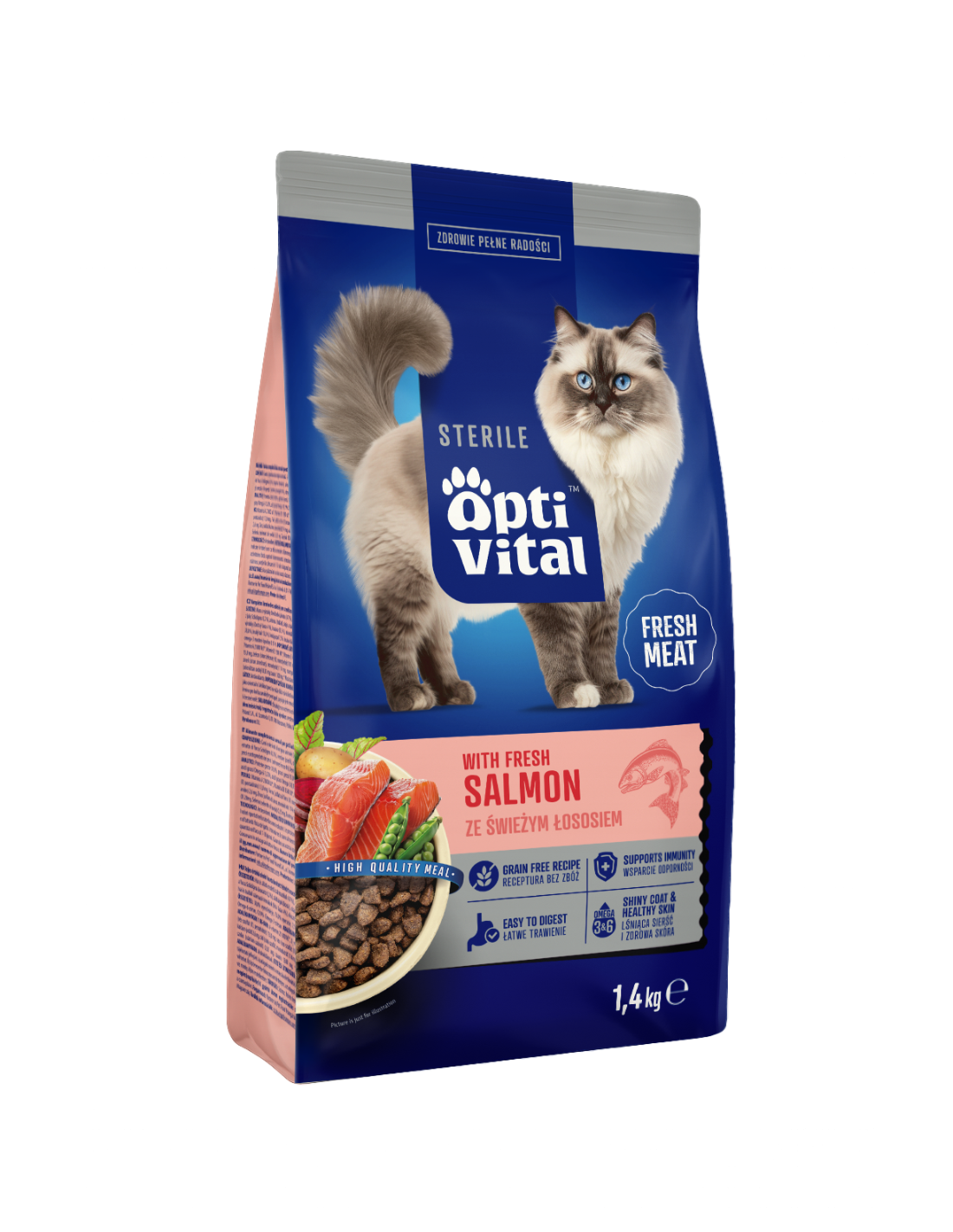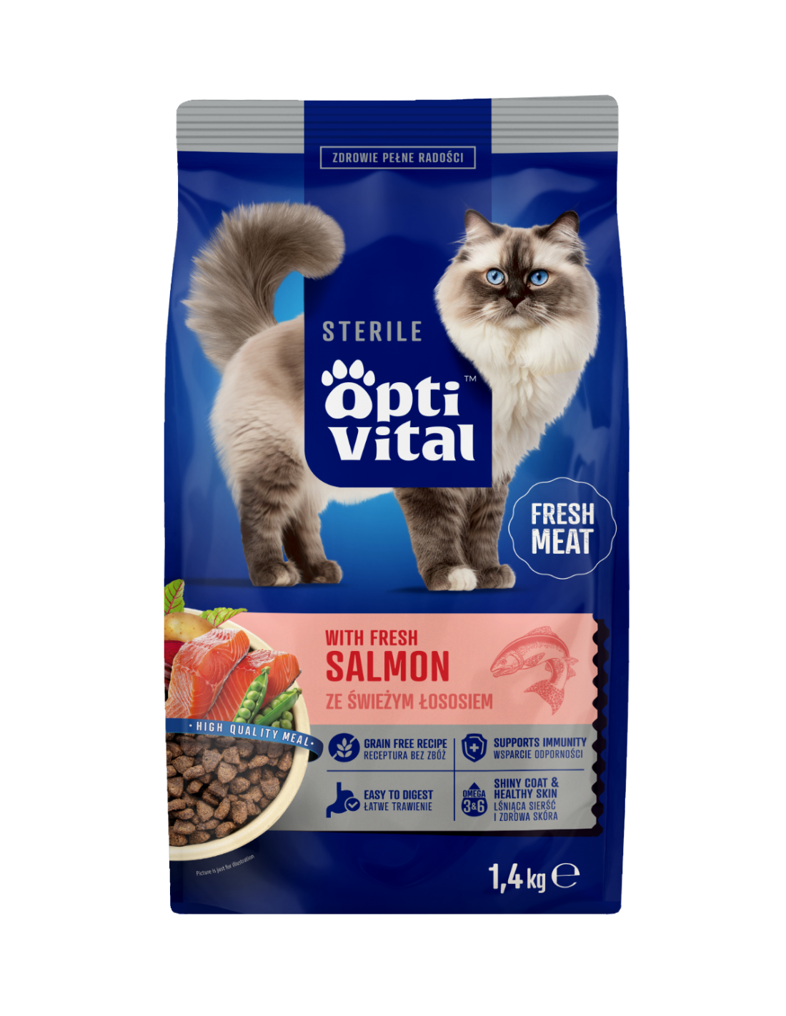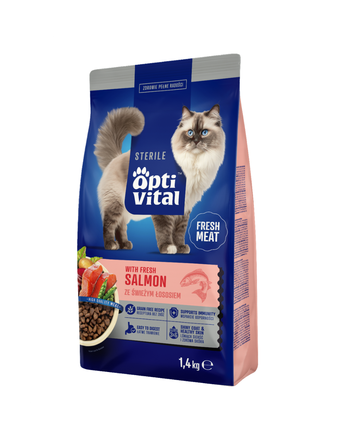 OptiVital z łososiem to pełnoporcjowa karma dla kotów sterylizowanych bez zbóż, która wspiera zdrowie, pomaga utrzymać prawidłową wagę i jednocześnie cieszy wyjątkowym smakiem.
