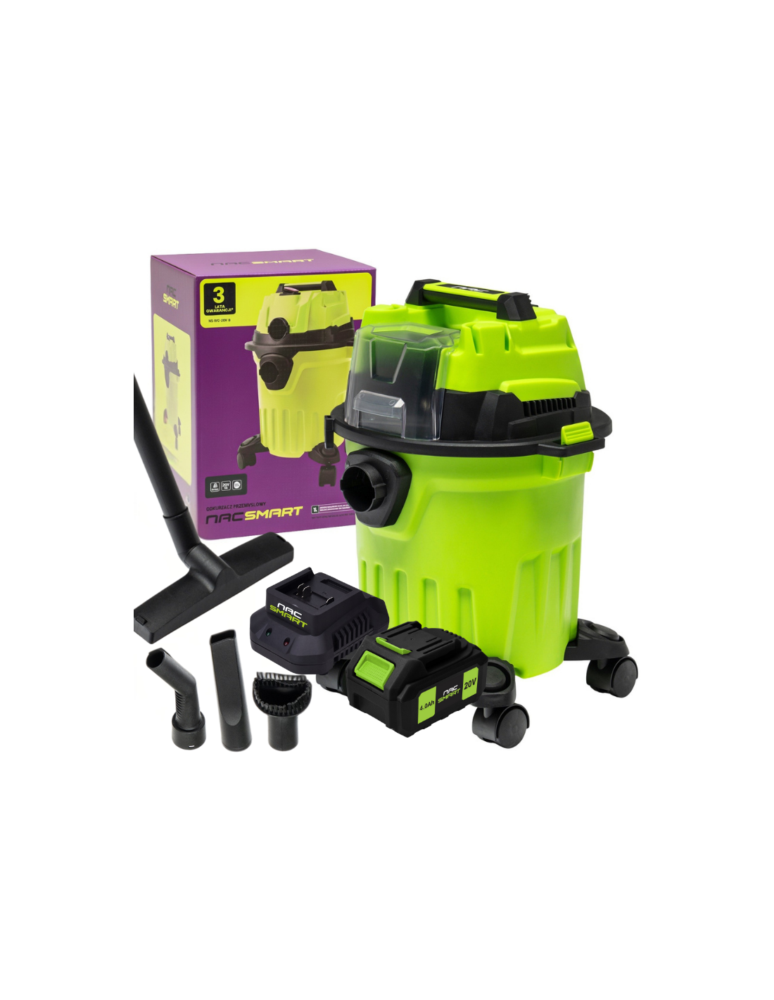 NS-IVC-20V-B to akumulatorowy odkurzacz warsztatowy, który ogarnia pył po szlifowaniu, trociny po cięciu, gruz po wierceniu, a także wodę z zalanych miejsc.