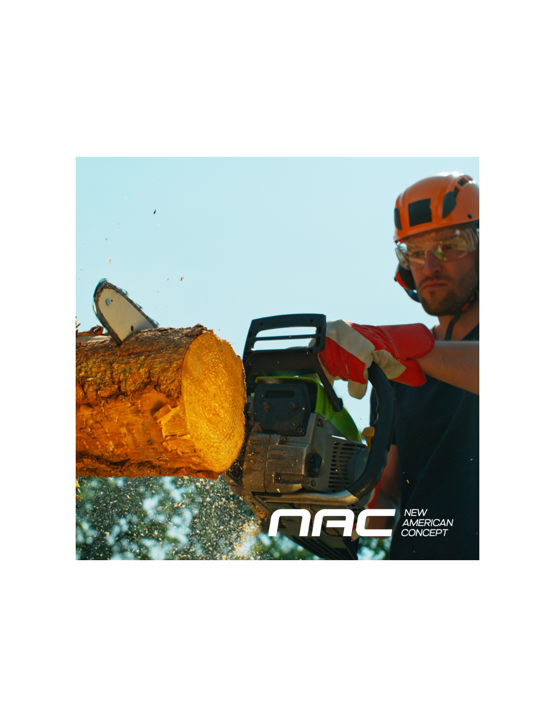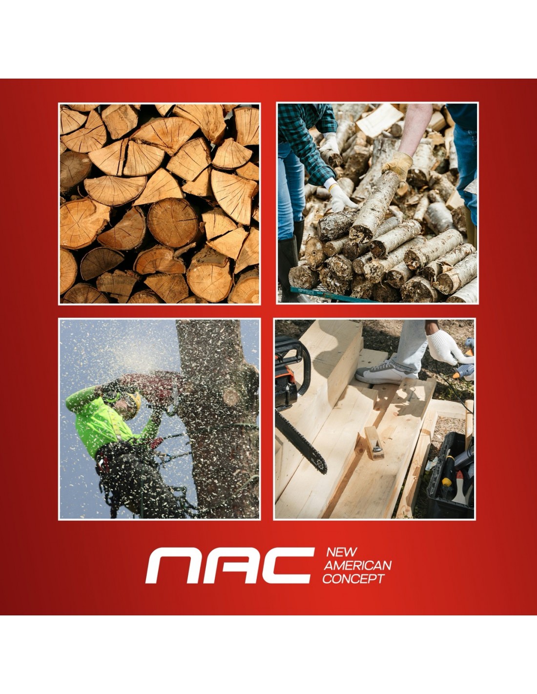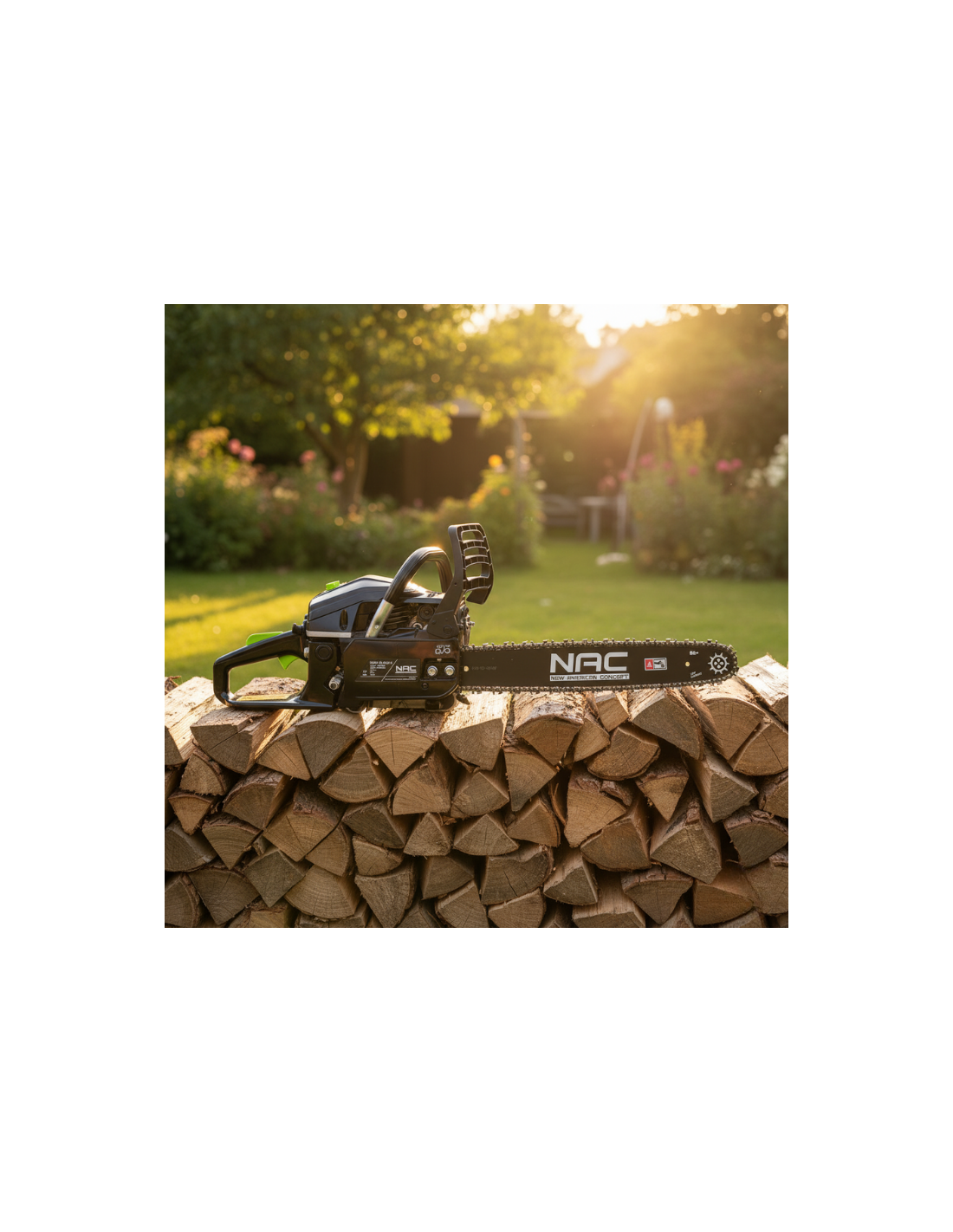 Wytrzymały zestaw (prowadnica + łańcuch) marki NAC umożliwia pewne i precyzyjne cięcie grubych pni czy gałęzi.