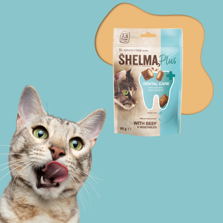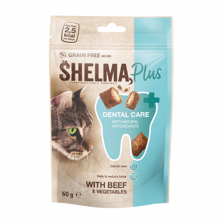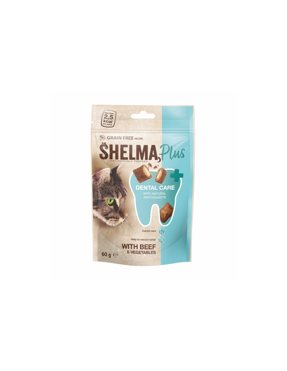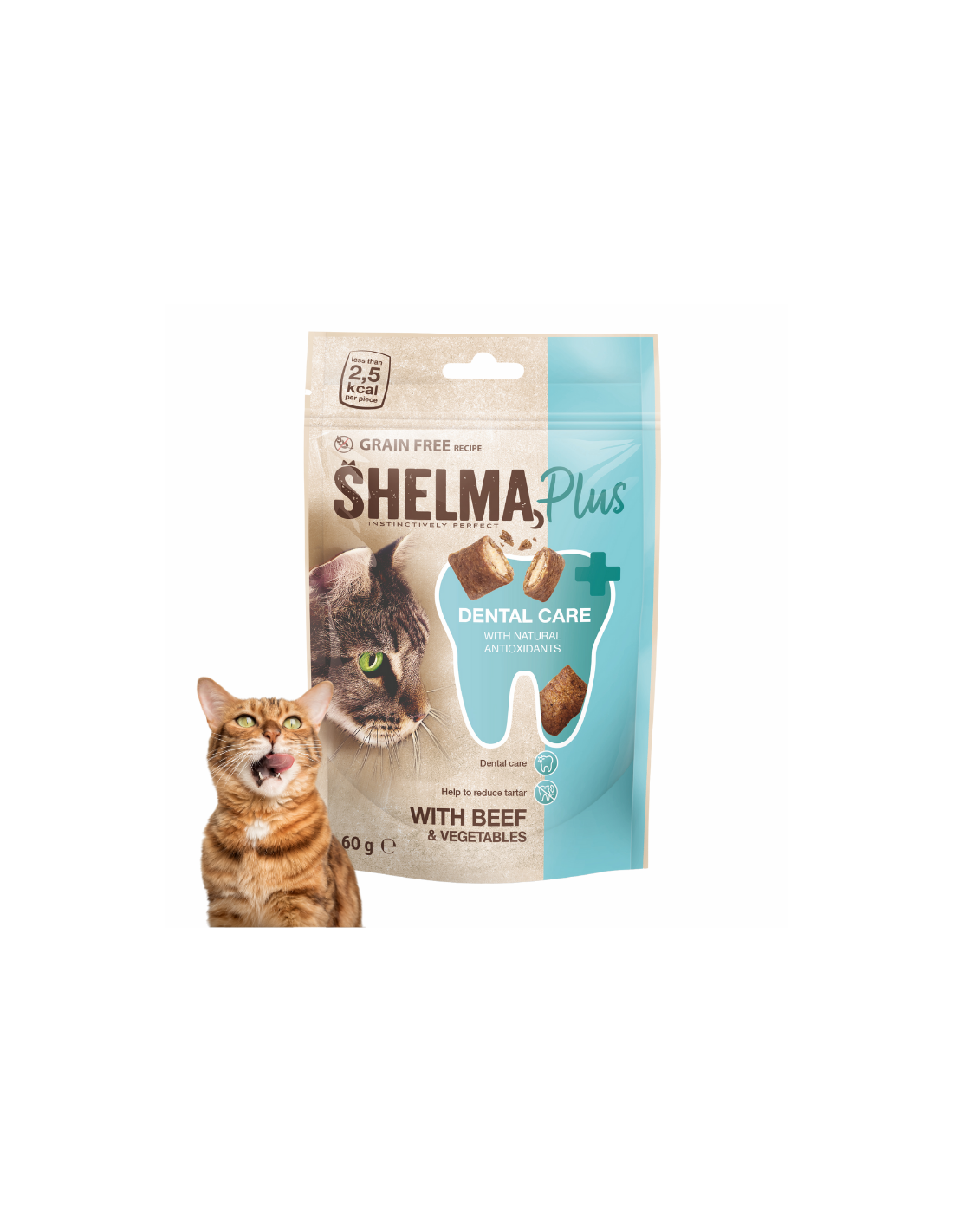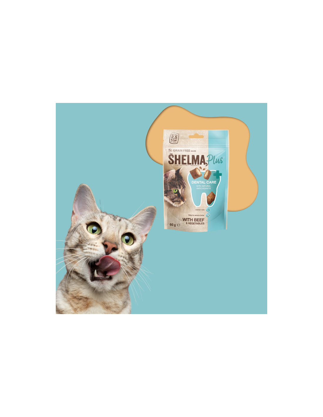 Nagradzaj swojego mruczka w najlepszy możliwy sposób - chrupiącymi poduszeczkami SHELMA Plus Dental, które łączą w sobie bogaty smak wołowiny i naturalną dobroć warzyw.
