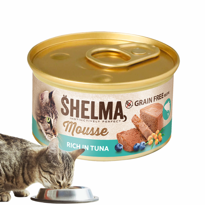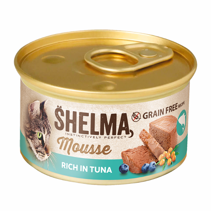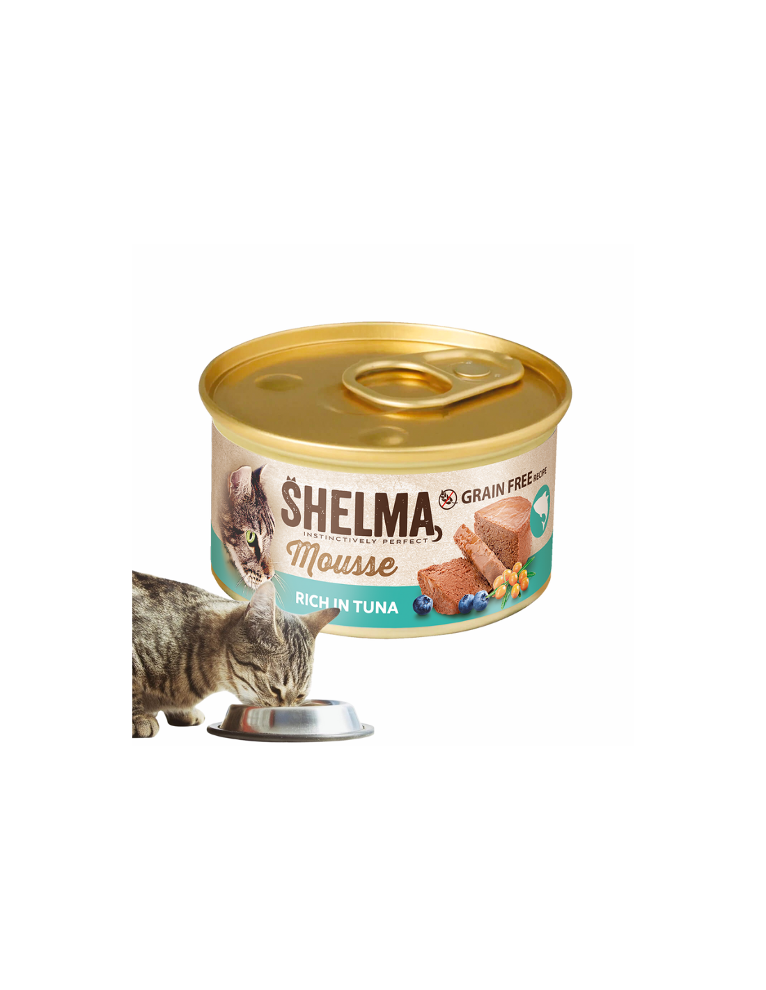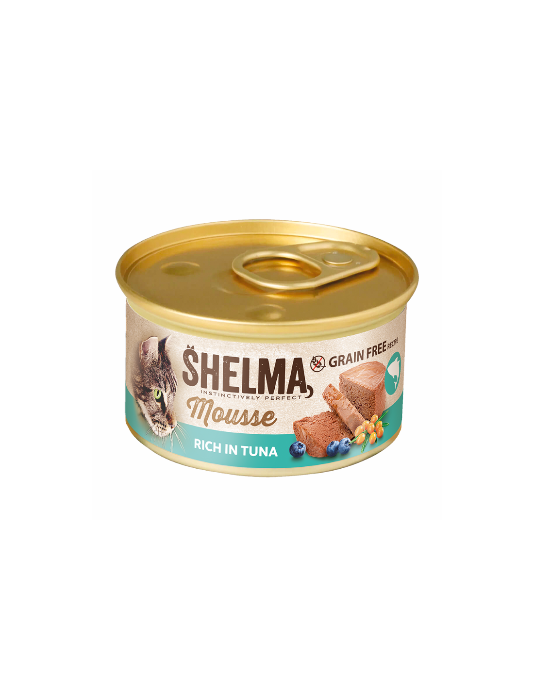 SHELMA mus dla dorosłych kotów bogaty w tuńczyka z jagodą i rokitnikiem 85g
