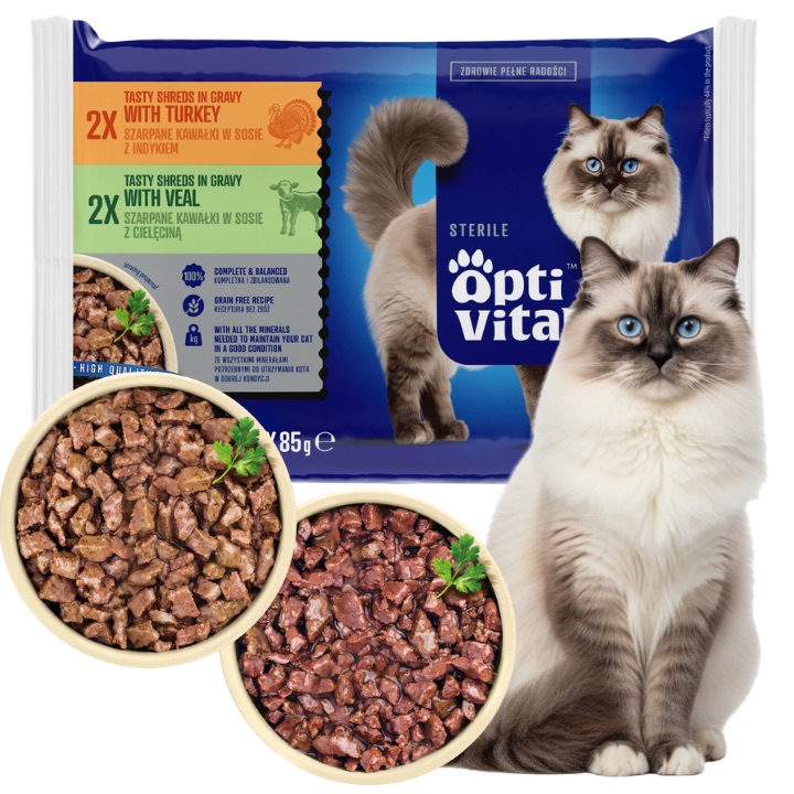 Po sterylizacji kot potrzebuje karmy, która wspiera metabolizm, pomaga kontrolować wagę i dostarcza wszystkich niezbędnych składników odżywczych. OptiVital Sterile z indykiem to pełnoporcjowa mokra karma bez zbóż, dopasowana do potrzeb kotów po zabiegu.