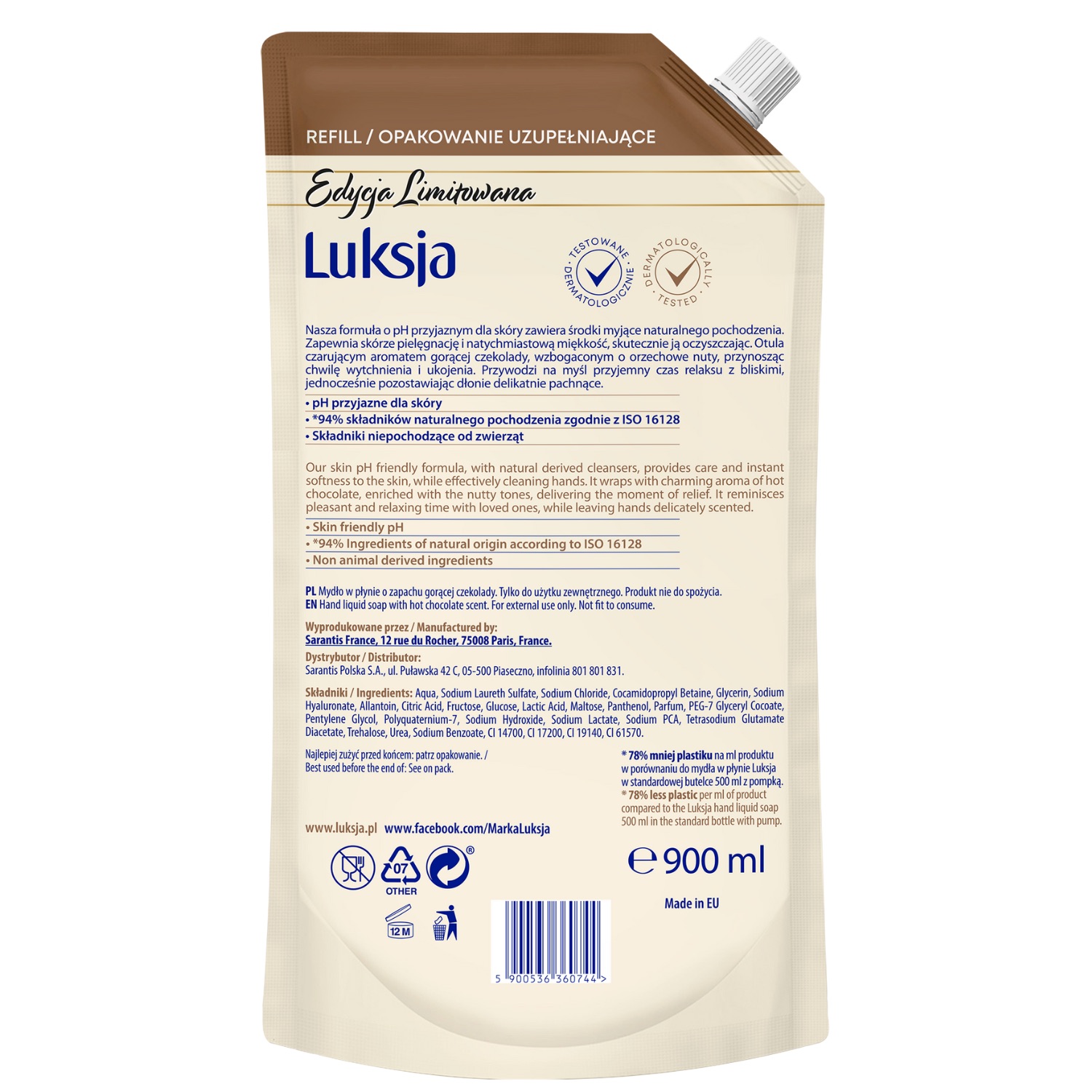 Mydło w płynie Luksja Gorąca Czekolada skutecznie oczyszcza skórę, zapewniając jej optymalną pielęgnację i natychmiastową miękkość.