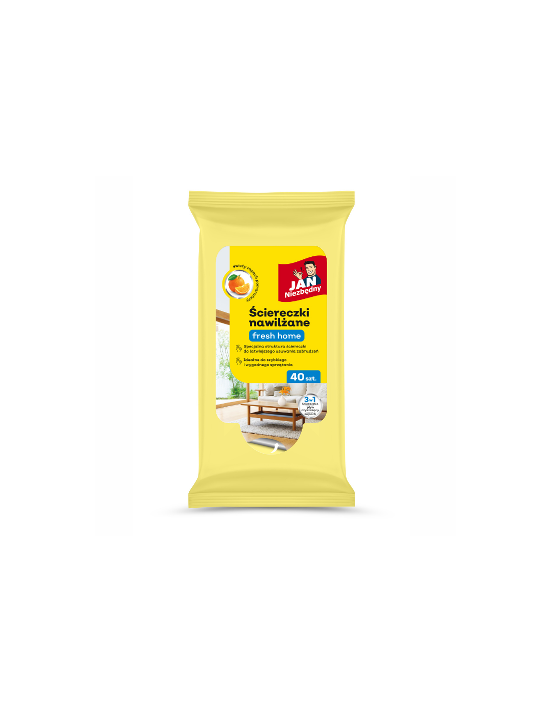 Zapomnij o bieganiu ze ścierką i płynem do każdej plamy. Ściereczki nawilżane JAN Niezbędny Fresh Home to Twoje podręczne pogotowie czystości. Wyciągasz, przecierasz i gotowe – specjalna struktura materiału usuwa kurz i brud, a w powietrzu unosi się świeży zapach pomarańczy.