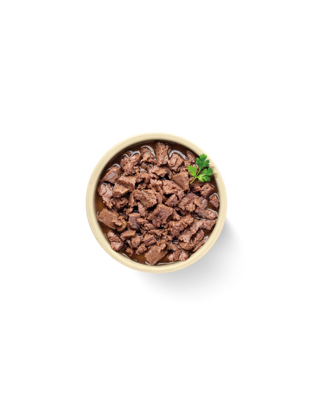 SKŁAD: mięso i produkty pochodzenia zwierzęcego (90% w kawałku*, w tym 9,1% cielęciny*), produkty pochodzenia roślinnego (0,4% inuliny), substancje mineralne. *Kawałki zazwyczaj stanowią 44% produktu.