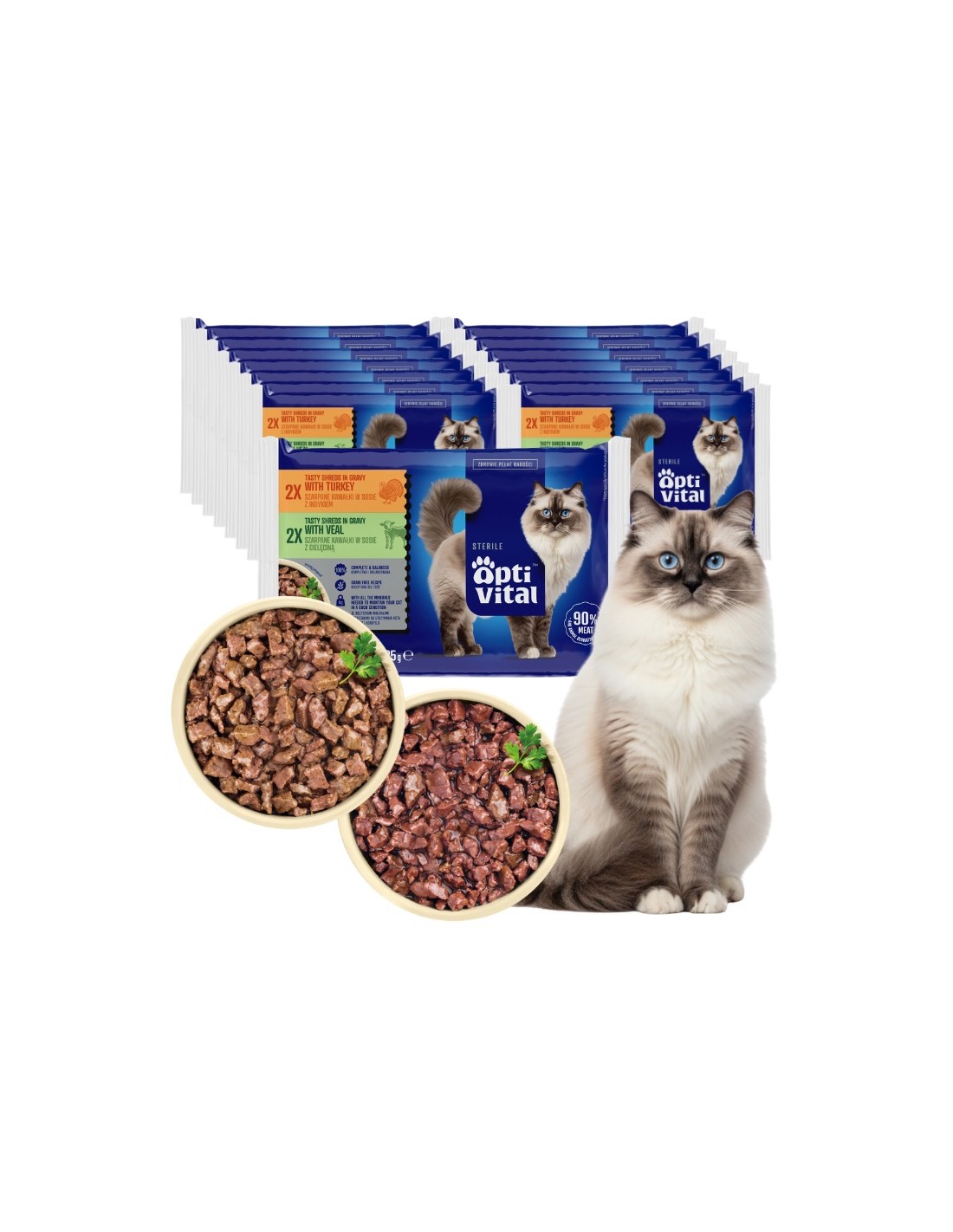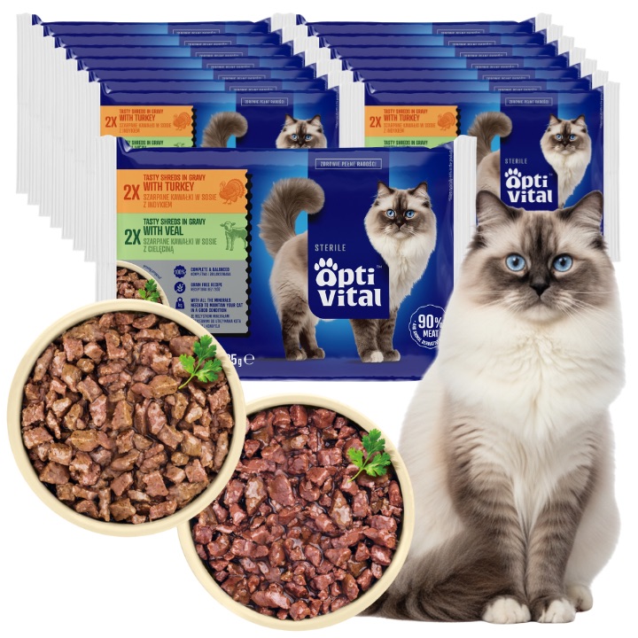 OptiVital Sterile zawiera aż 90% mięsa i produktów pochodzenia zwierzęcego w kawałku. Soczysty indyk w sosie to smak, któremu mało który kot potrafi się oprzeć.