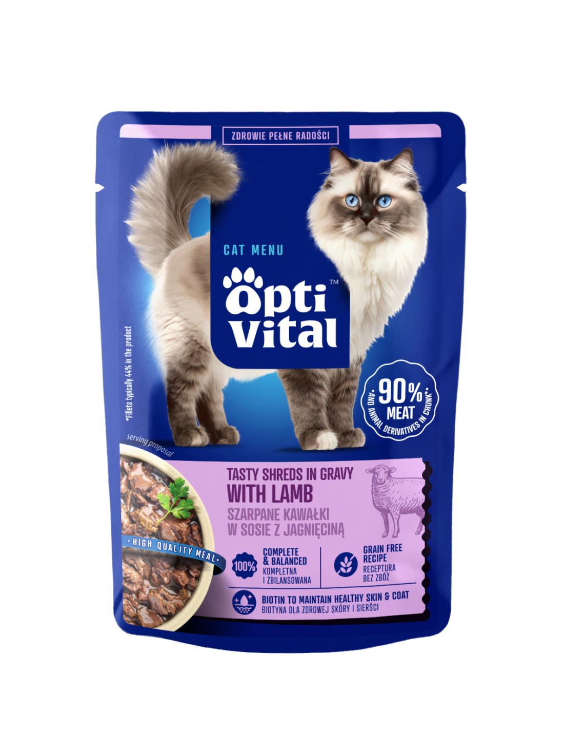 Karma pełnoporcjowa dla dorosłych kotów z jagnięciną w sosie. Szarpane kawałki.