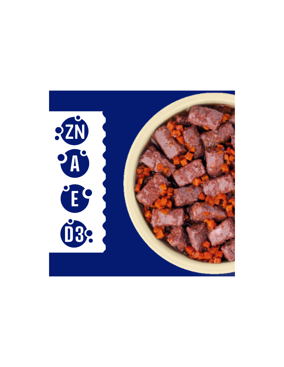 Skład: mięso i produkty pochodzenia zwierzęcego (90% w kawałkach* w tym 8% jagnięcina, 8% drób, 8% wątróbka), warzywa (marchewka 4%), produkty pochodzenia roślinnego, roślinne ekstrakty białkowe, substancje mineralne. *Kawałki zazwyczaj stanowią 54% produktu.