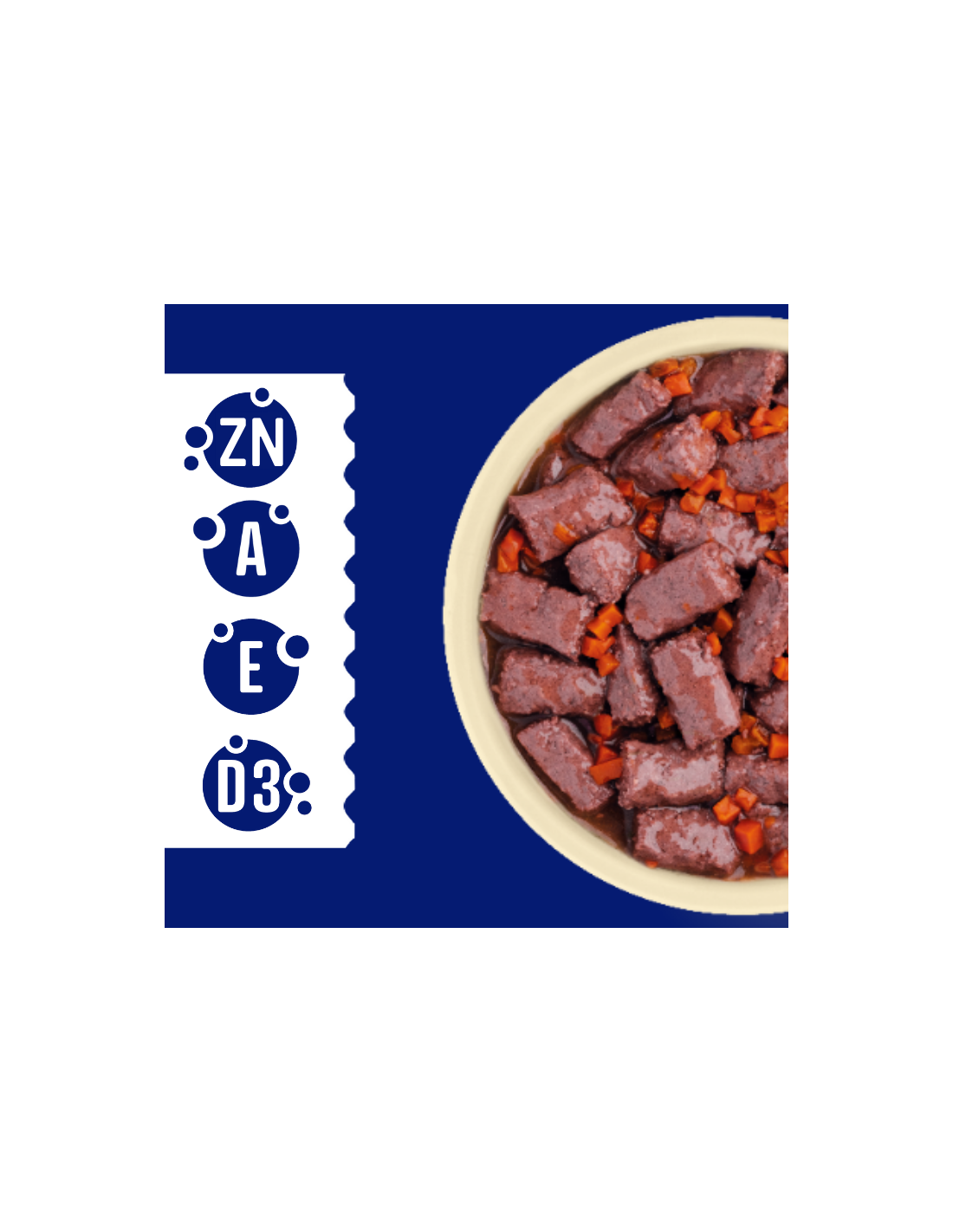Skład: mięso i produkty pochodzenia zwierzęcego (90% w kawałkach* w tym 8% cielęcina, 8% wątróbka, 8% serca), warzywa (marchewka 4%), produkty pochodzenia roślinnego, roślinne ekstrakty białkowe, substancje mineralne. *Kawałki zazwyczaj stanowią 54% produktu.