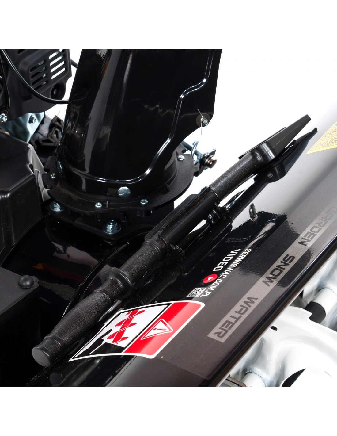 Komin wyrzutowy posiada regulację, którą obsługujesz wygodnie za pomocą uchwytu i dźwigni przy panelu sterowania. Pozwala to precyzyjnie kierować strumień śniegu na bok z dala od odśnieżanej ścieżki.