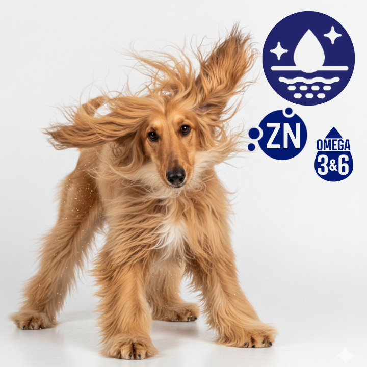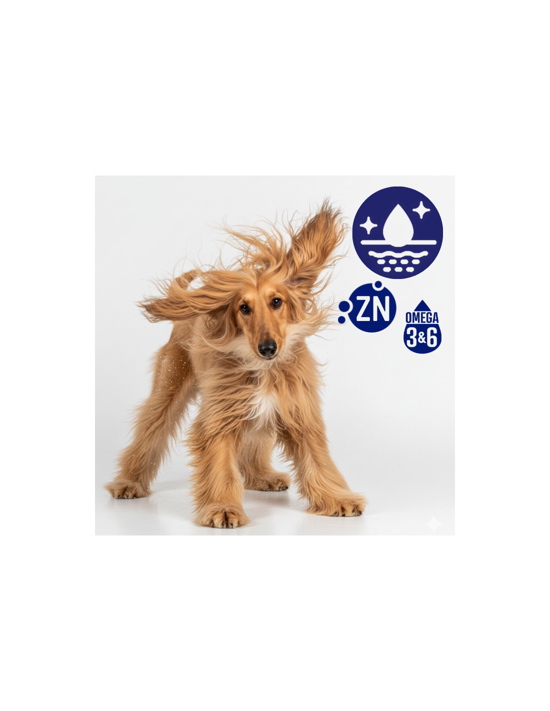 Puszysta, błyszcząca sierść to najlepszy wskaźnik zdrowia. Dlatego stworzyliśmy potężny duet: OLEJ Z ŁOSOSIA, bogaty w kwasy Omega-3 i Omega-6, oraz CYNK. Podczas gdy kwasy tłuszczowe głęboko odżywiają, cynk aktywnie wspiera regenerację skóry i wzmacnia strukturę włosa. To połączenie redukuje nadmierne linienie i sprawia, że futro Twojego psa staje się gęste, mocne i jedwabiście gładkie.