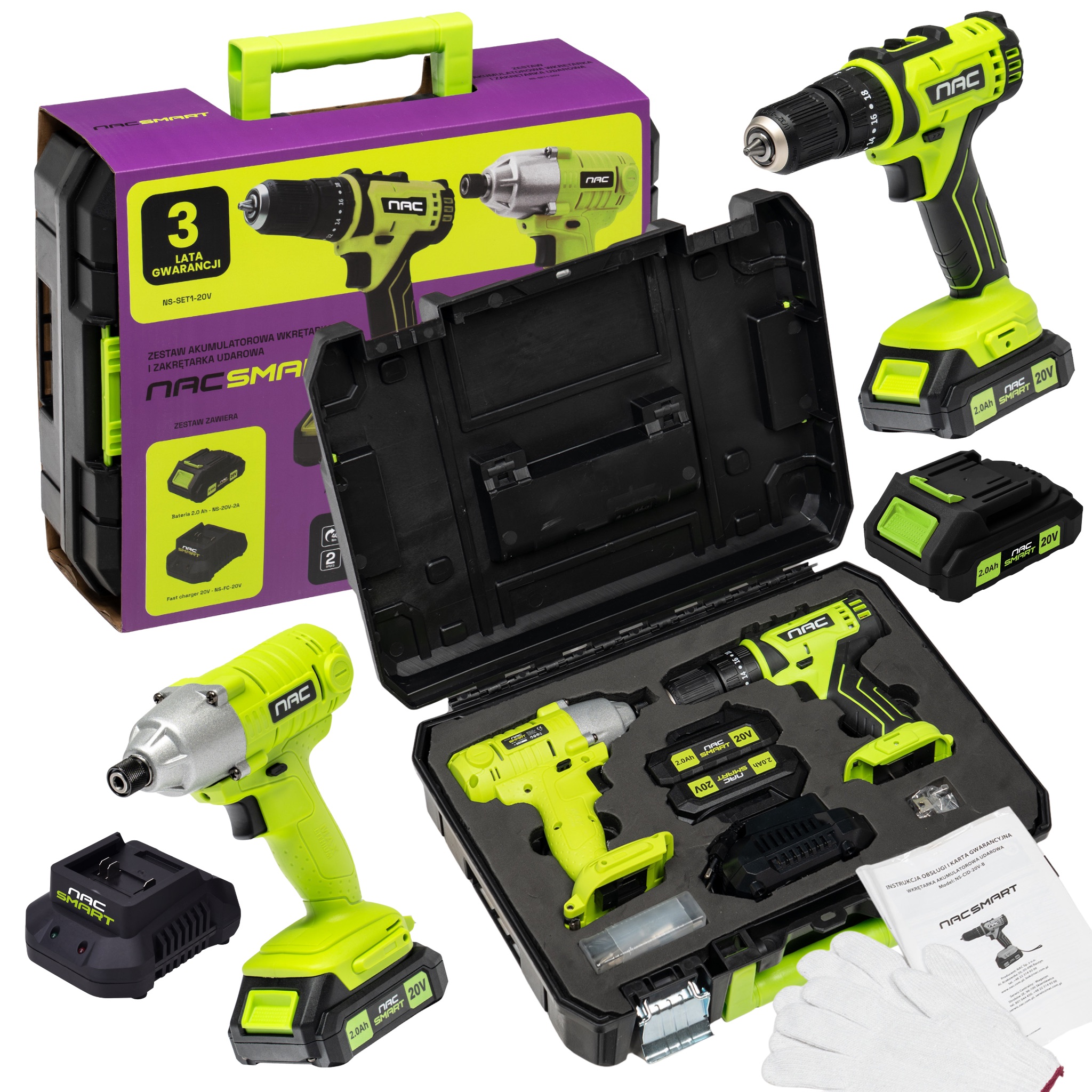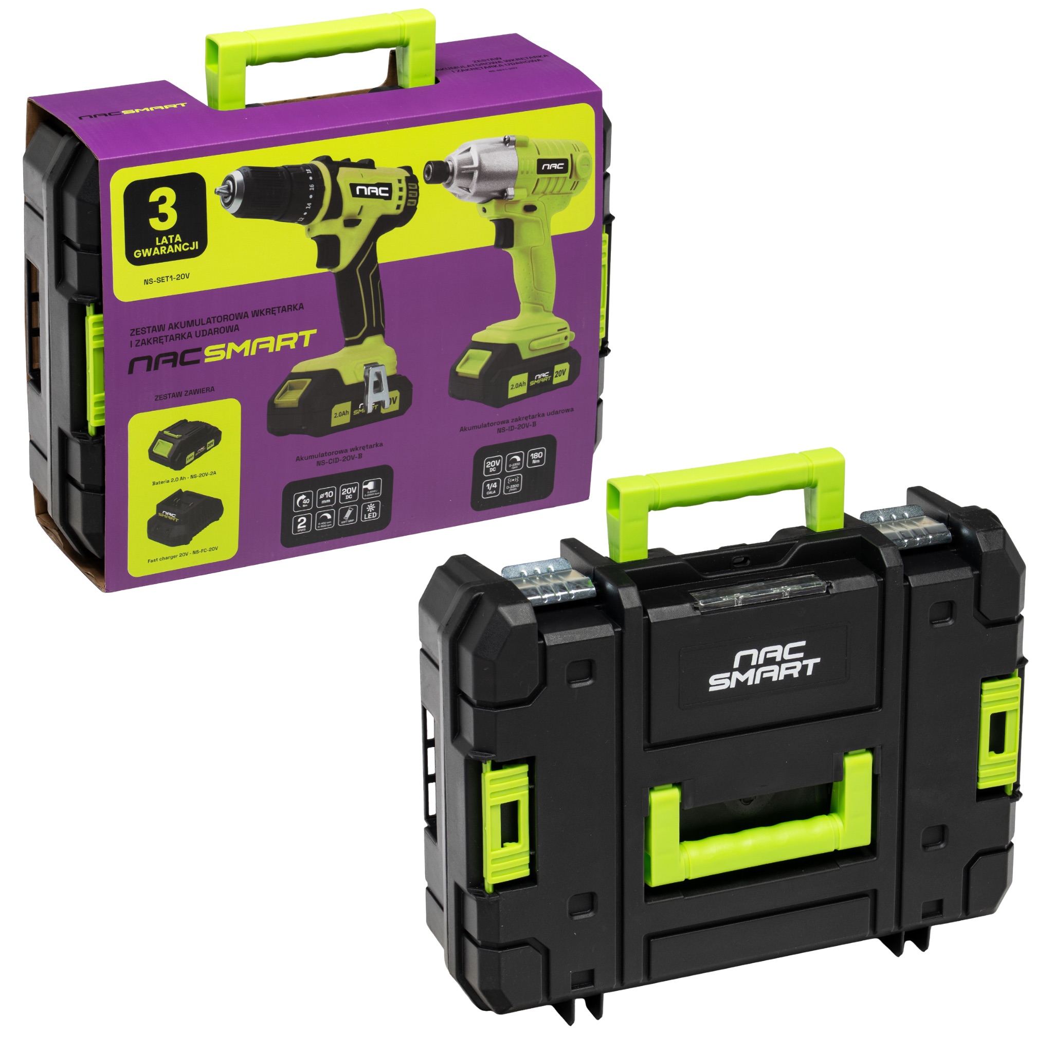 Zestaw NAC SMART: wkrętarka akumulatorowa + zakrętarka udarowa + akumulator + szybka ładowarka