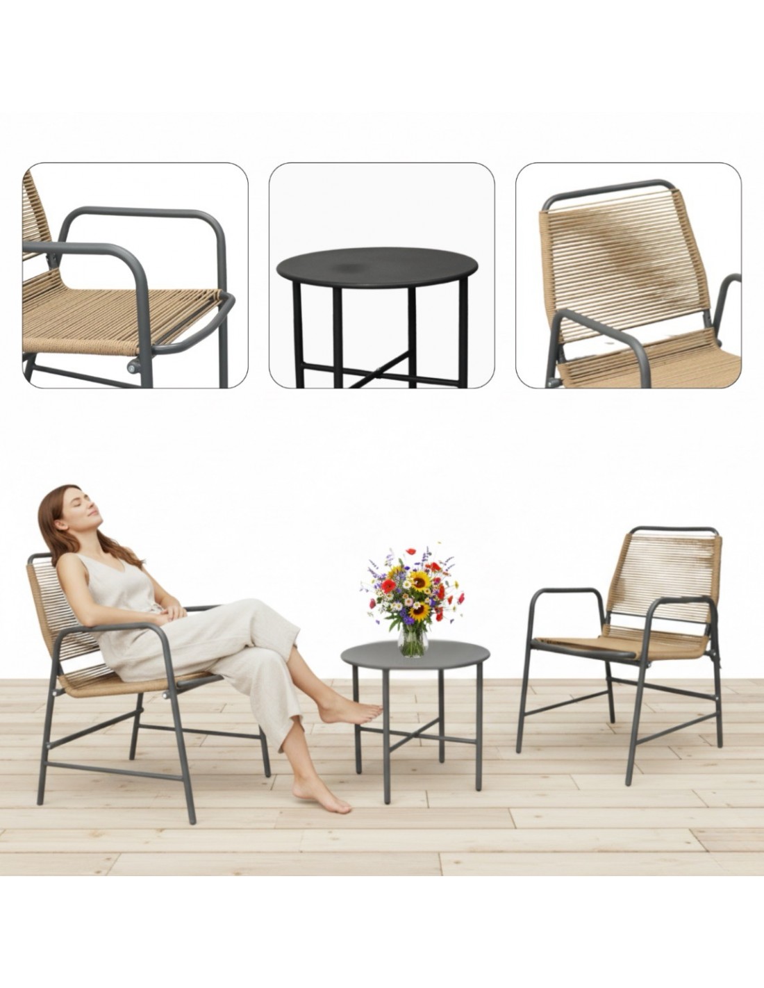 - Zawartość zestawu: 2 wyprofilowane krzesła, 1 okrągły stolik kawowy