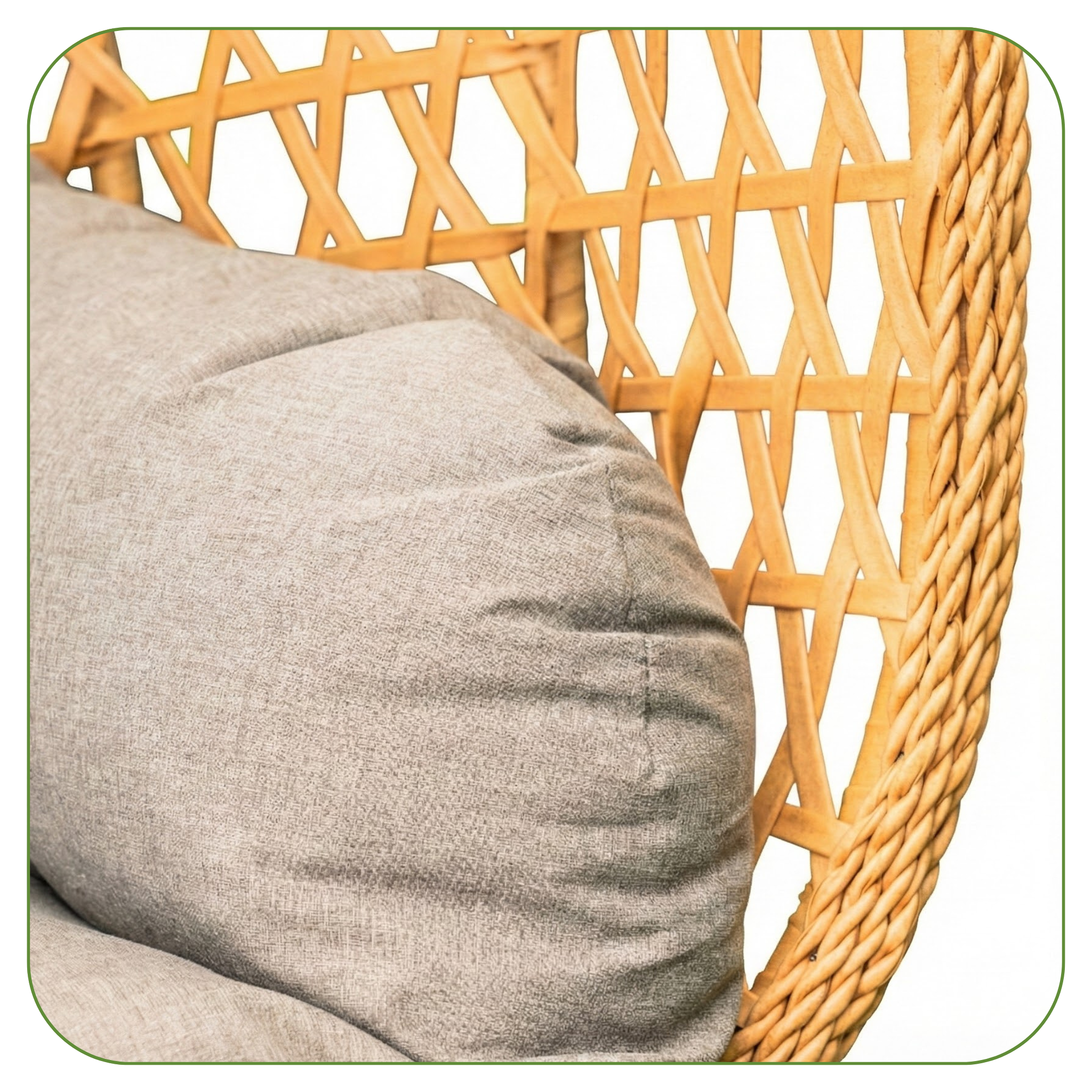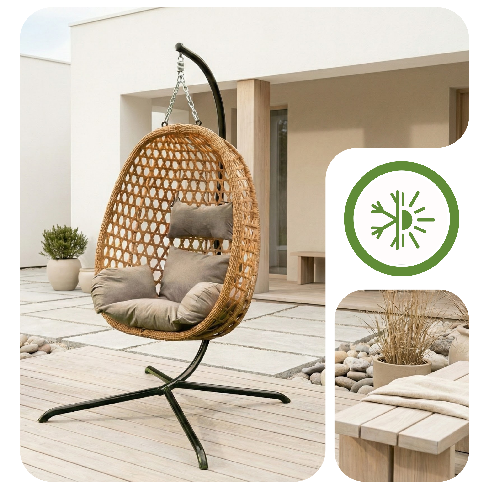 Fotel wiszący ogrodowy MEVEN AURA z technorattanu, naturalny jasnoszare poduszki