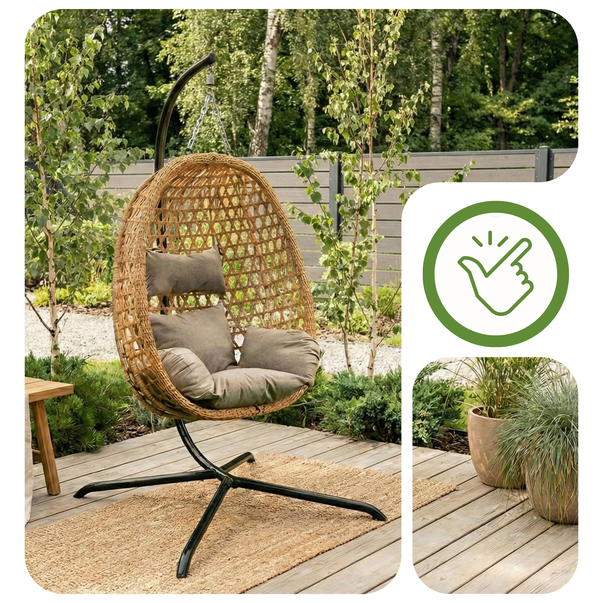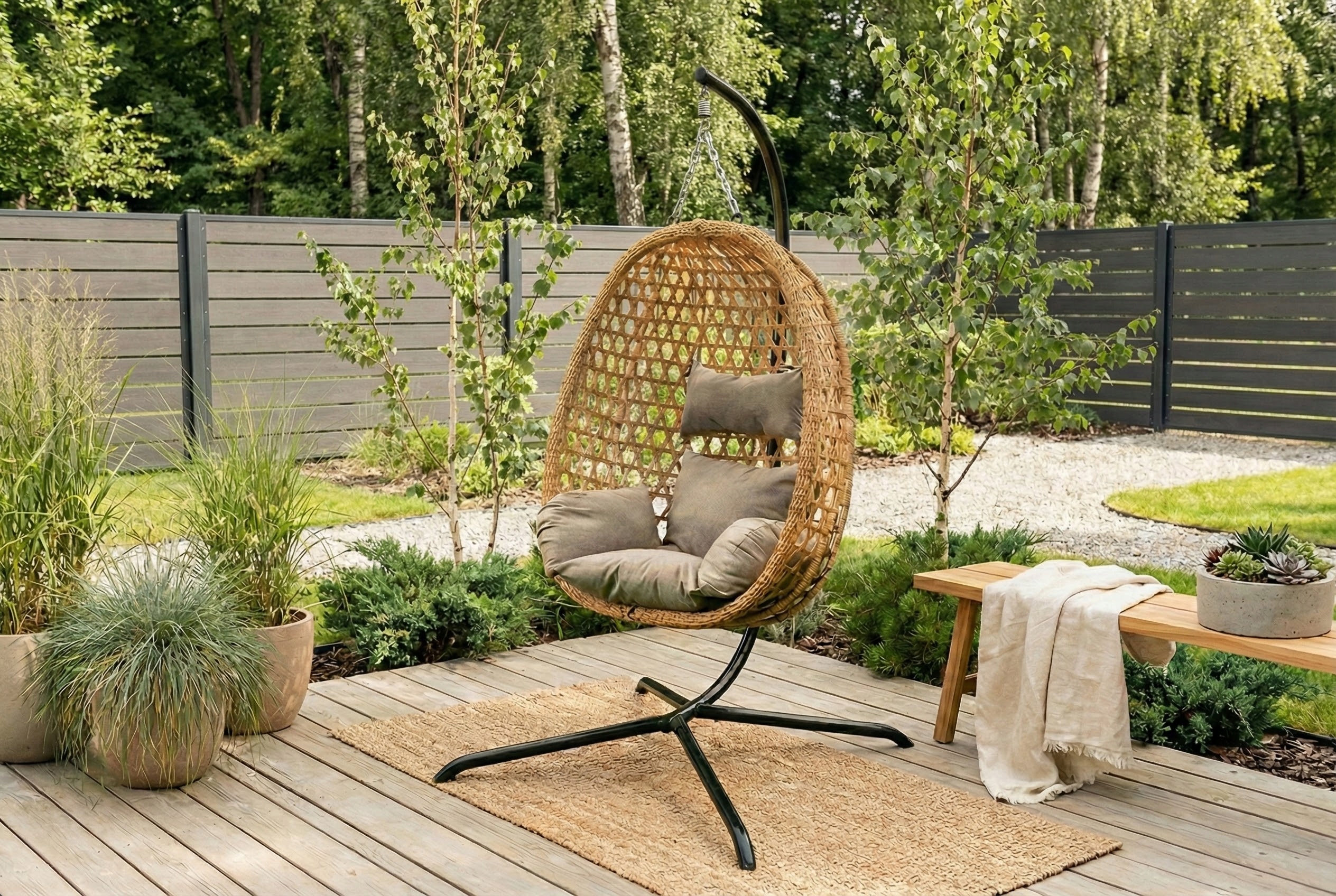 Stabilny i wolnostojący stelaż pozwala Ci na pełną swobodę bez kłopotliwego montażu na stałe. Z łatwością przeniesiesz swój ulubiony kokon z tarasu do salonu lub sypialni, dzięki czemu luksusowy komfort towarzyszy Ci przez okrągły rok, niezależnie od pogody. Zyskujesz uniwersalny mebel, który zawsze znajduje się dokładnie tam, gdzie aktualnie masz ochotę na chwilę błogiego wytchnienia.