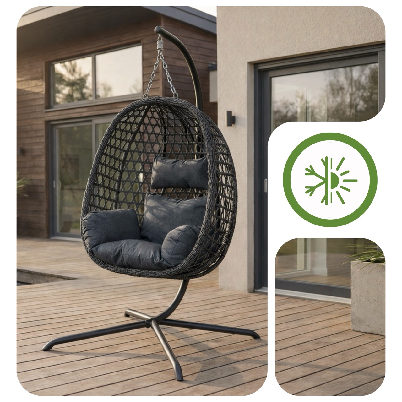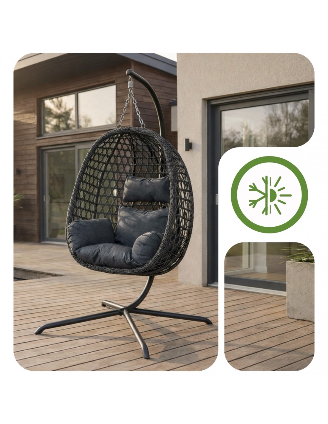 Stabilny i wolnostojący stelaż pozwala Ci na pełną swobodę bez kłopotliwego montażu na stałe. Z łatwością przeniesiesz swój ulubiony kokon z tarasu do salonu lub sypialni, dzięki czemu luksusowy komfort towarzyszy Ci przez okrągły rok, niezależnie od pogody. Zyskujesz uniwersalny mebel, który zawsze znajduje się dokładnie tam, gdzie aktualnie masz ochotę na chwilę błogiego wytchnienia.