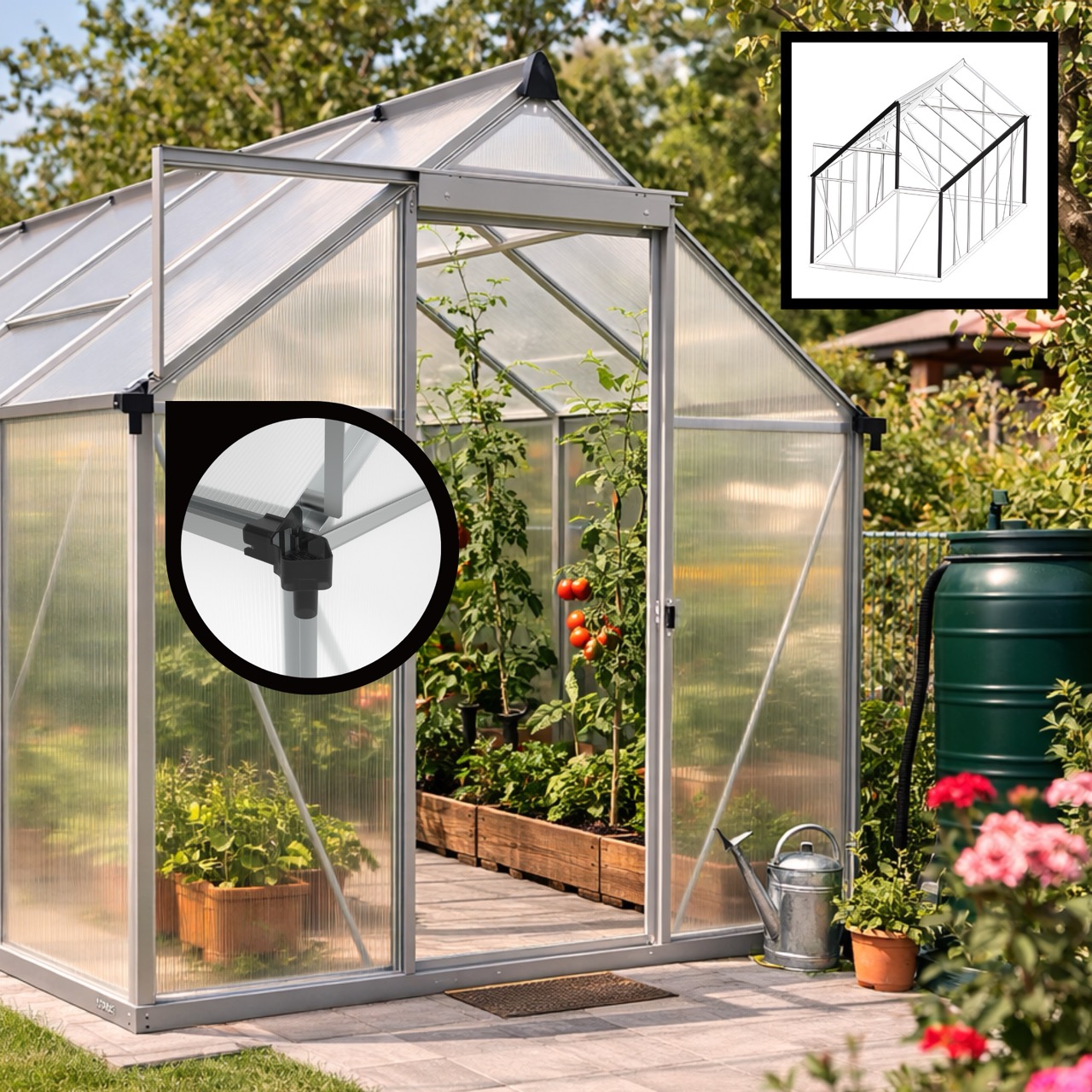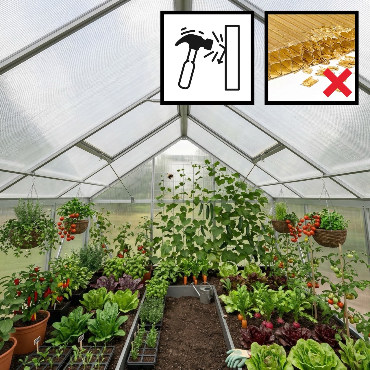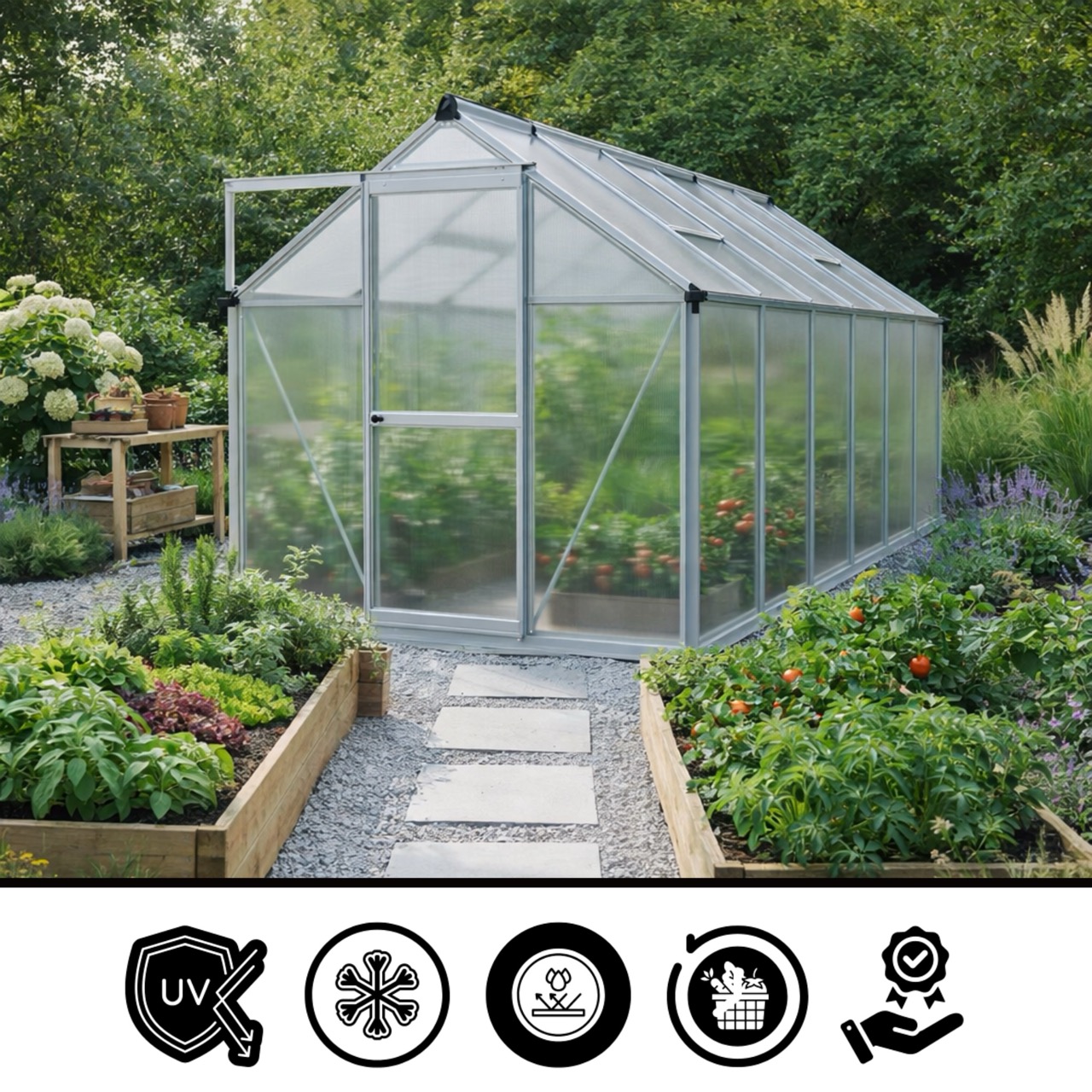 ✅ Poszycie z poliwęglanu z filtrem UV: nietłukący się materiał, który doskonale trzyma ciepło, a jednocześnie skutecznie chroni Twoje rośliny przed poparzeniami słonecznymi.