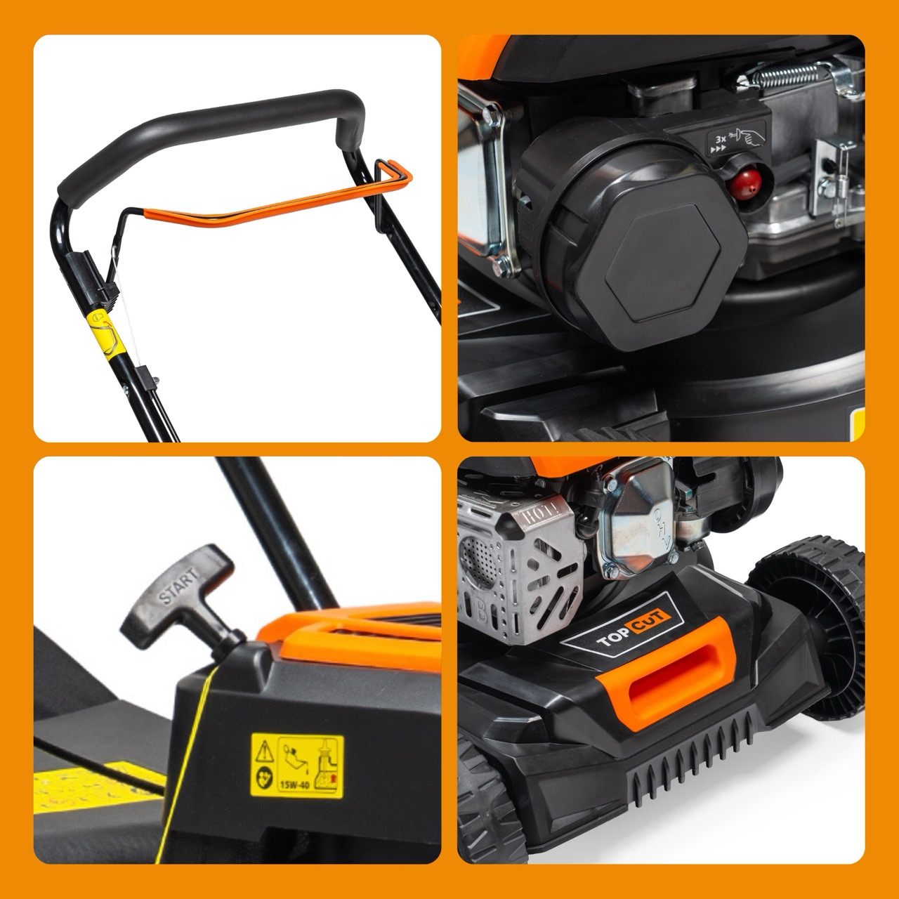 To proste: skręć uchwyty za pomocą dołączonych motylków, wlej ok. 0,4L oleju SAE 30 do miski olejowej, zatankuj świeżą benzynę Bezołowiową 95, naciśnij 3-krotnie pompkę paliwa (primer) i pociągnij za linkę startową. Maszyna jest gotowa do pracy!
