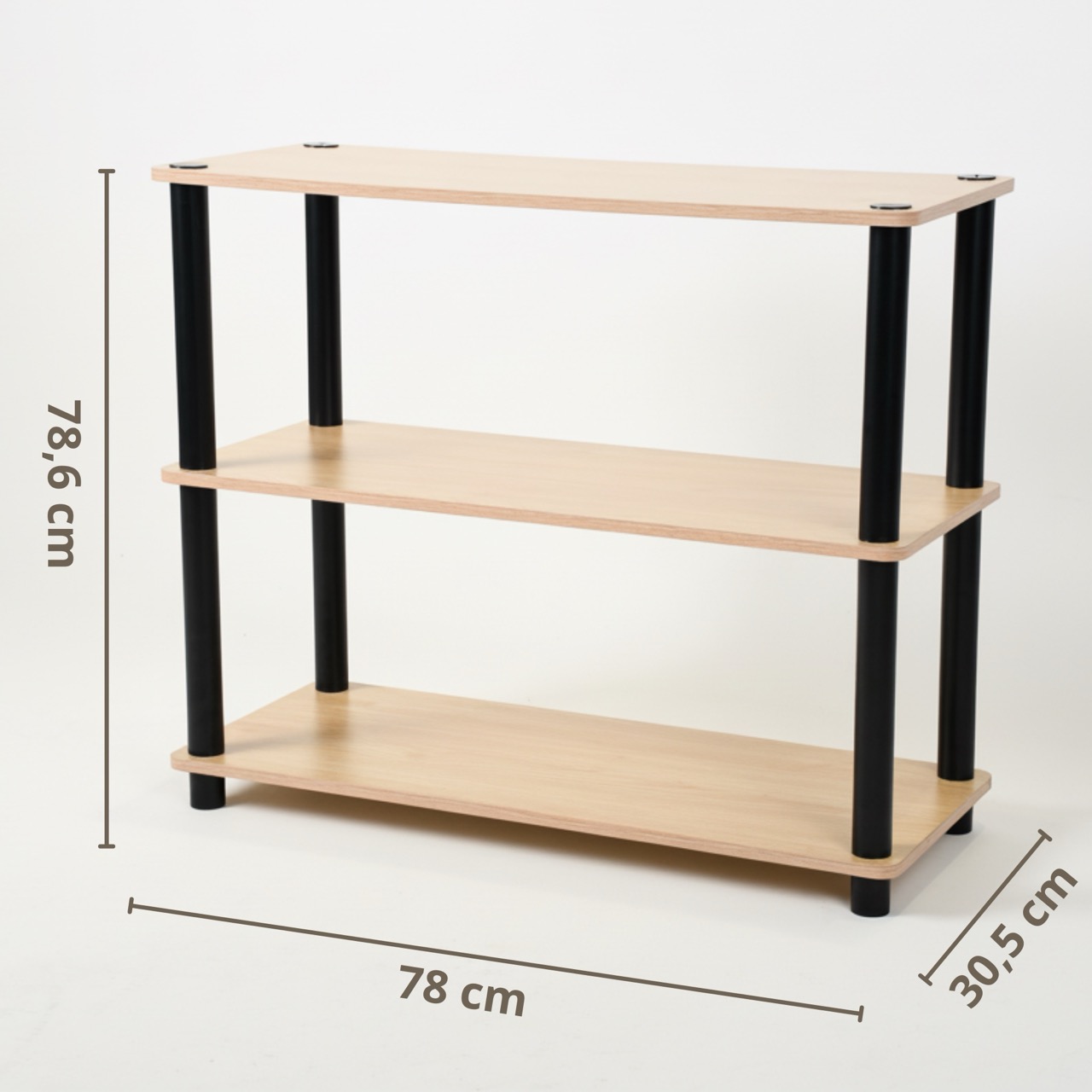 • Wymiary całkowite zmontowanego regału: 78 cm (szerokość) x 30.5 cm (głębokość) x 78.6 cm (wysokość)