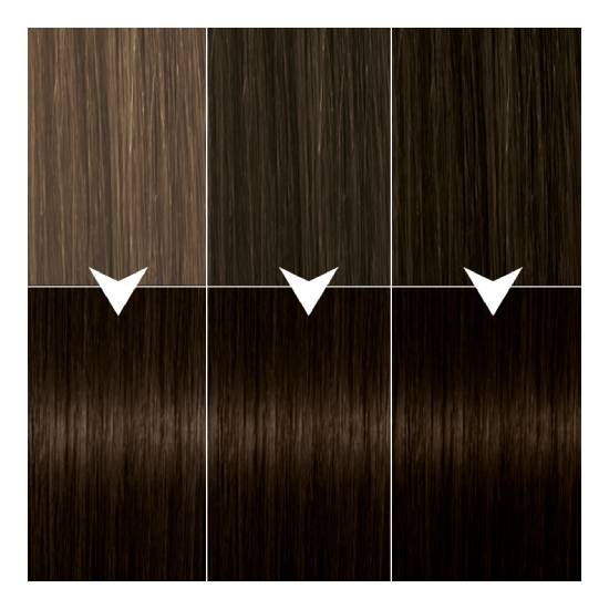 Precyzyjna aplikacja zapewnia profesjonalny efekt koloryzacji. Do włosów krótkich lub średniej długości użyj 1 opakowania Syoss Oleo Intense. Do włosów średniej długości, długich lub kręconych użyj 2 opakowań Syoss Oleo Intense. Ten odcień jest odpowiedni dla włosów w tonacji od ciemnego blondu po ciemny brąz. 100% pokrycia siwych włosów.