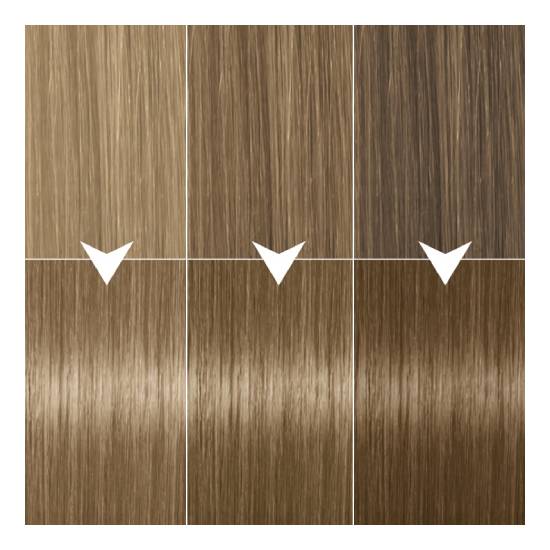 Precyzyjna aplikacja zapewnia profesjonalny efekt koloryzacji. Do włosów krótkich lub średniej długości użyj 1 opakowania Syoss Oleo Intense. Do włosów średniej długości, długich lub kręconych użyj 2 opakowań Syoss Oleo Intense. Ten odcień jest odpowiedni dla włosów w tonacji od jasnego do ciemnego blondu. 100% pokrycia siwych włosów.